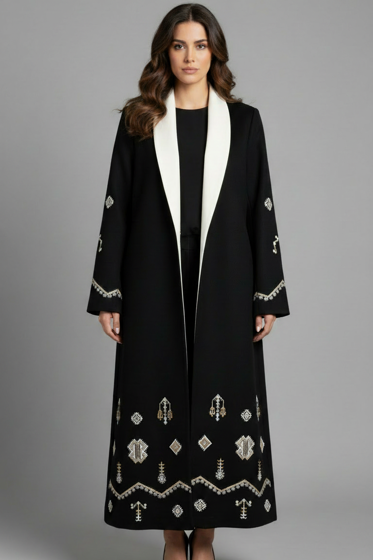 Embroidered satin abaya is made from Special Bait Hanayen Crepe. It has open front design...