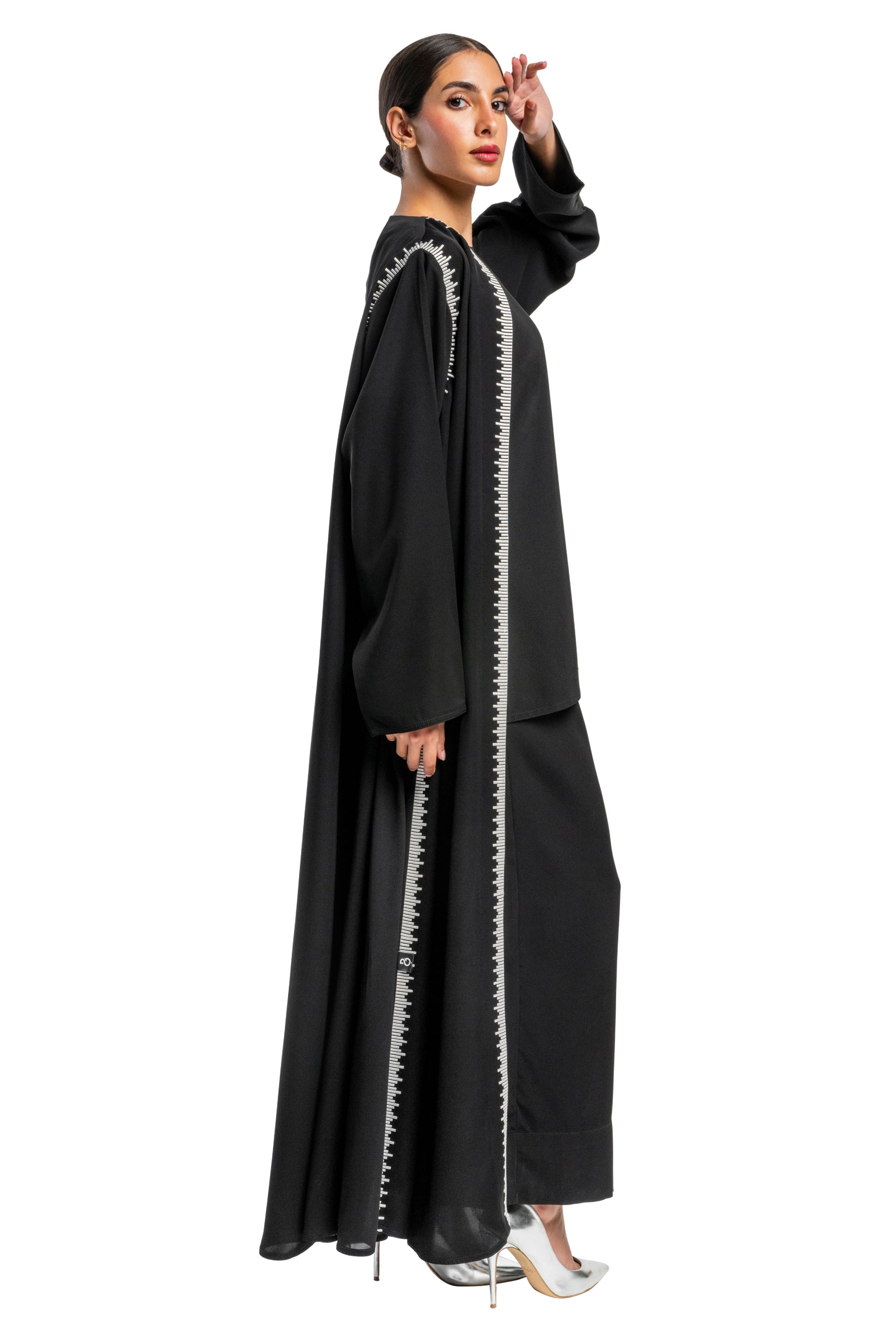 عباية مصنوعة من كريب بيت حناين الخاص. تتميز بـ بتطريز و تصميم مفتوح من الأمام، متوفرة باللون أسود. تصميم كويتي. متوفر خدمة شحن حول العالم