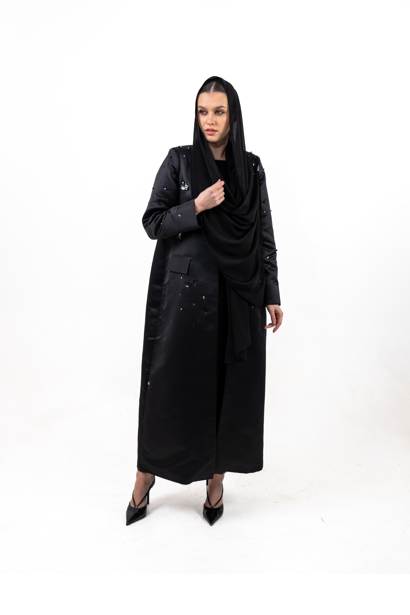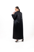 عباية مصنوعة من كريب بيت حناين الخاص. تتميز بـ بتطريز و تصميم مفتوح من الأمام، متوفرة باللون أسود. تصميم كويتي. متوفر خدمة شحن حول العالم