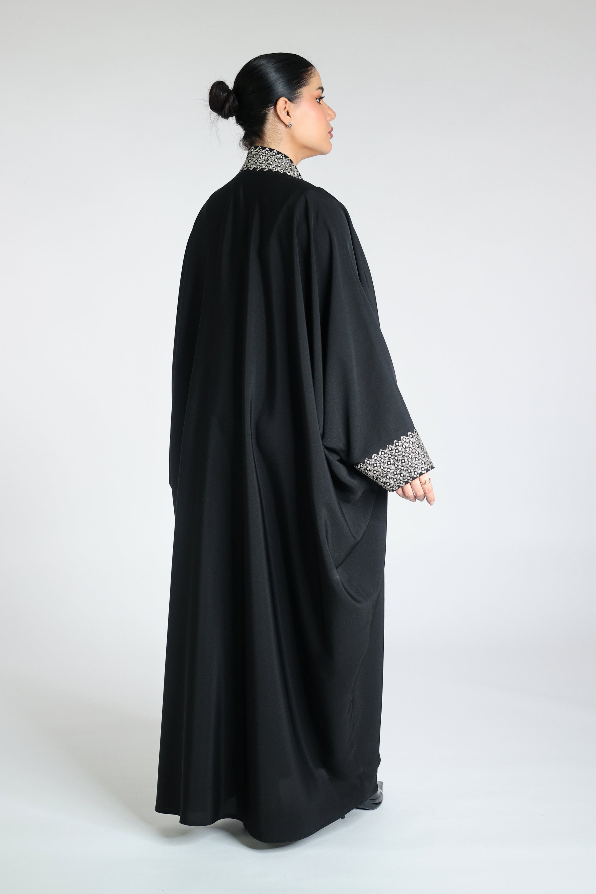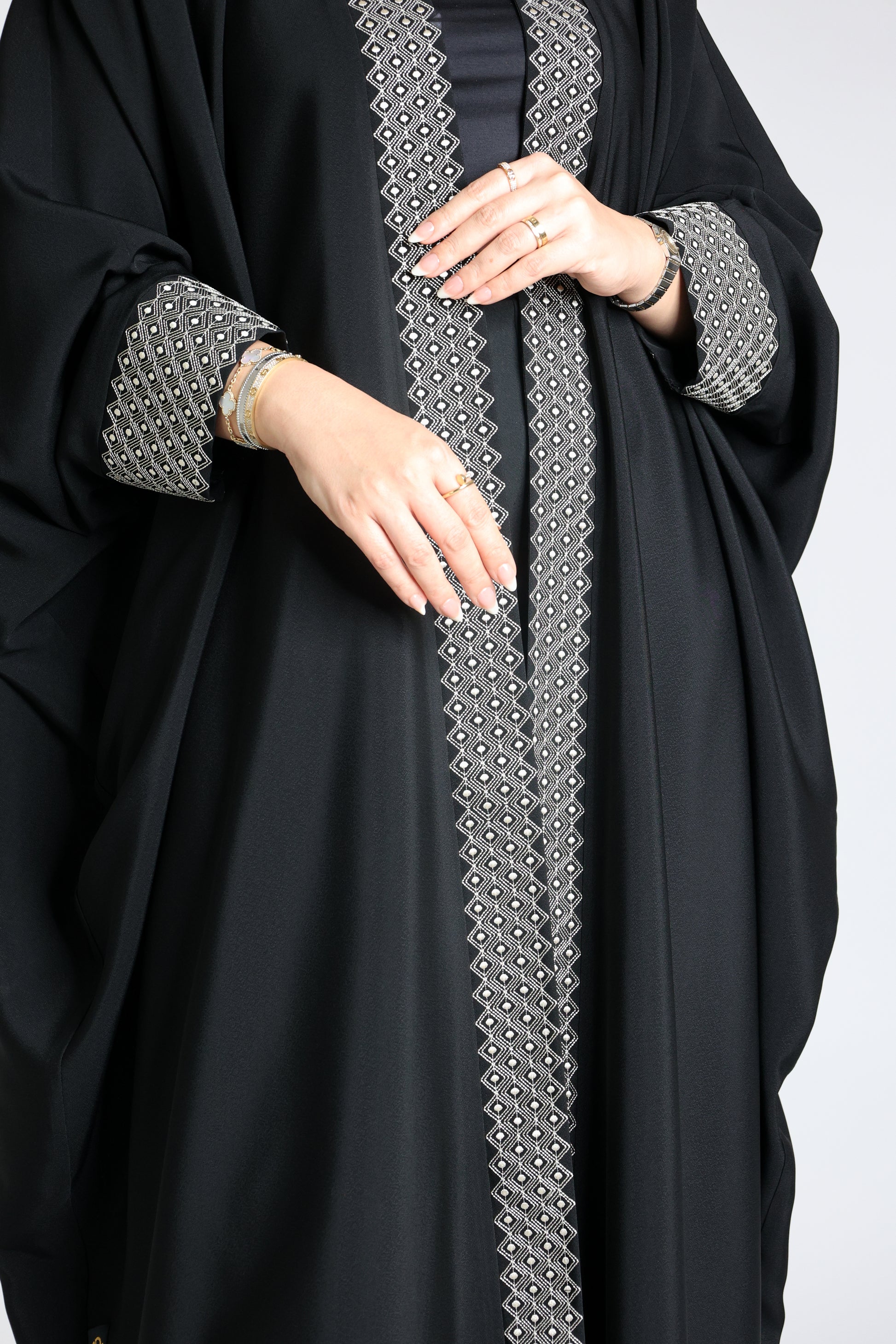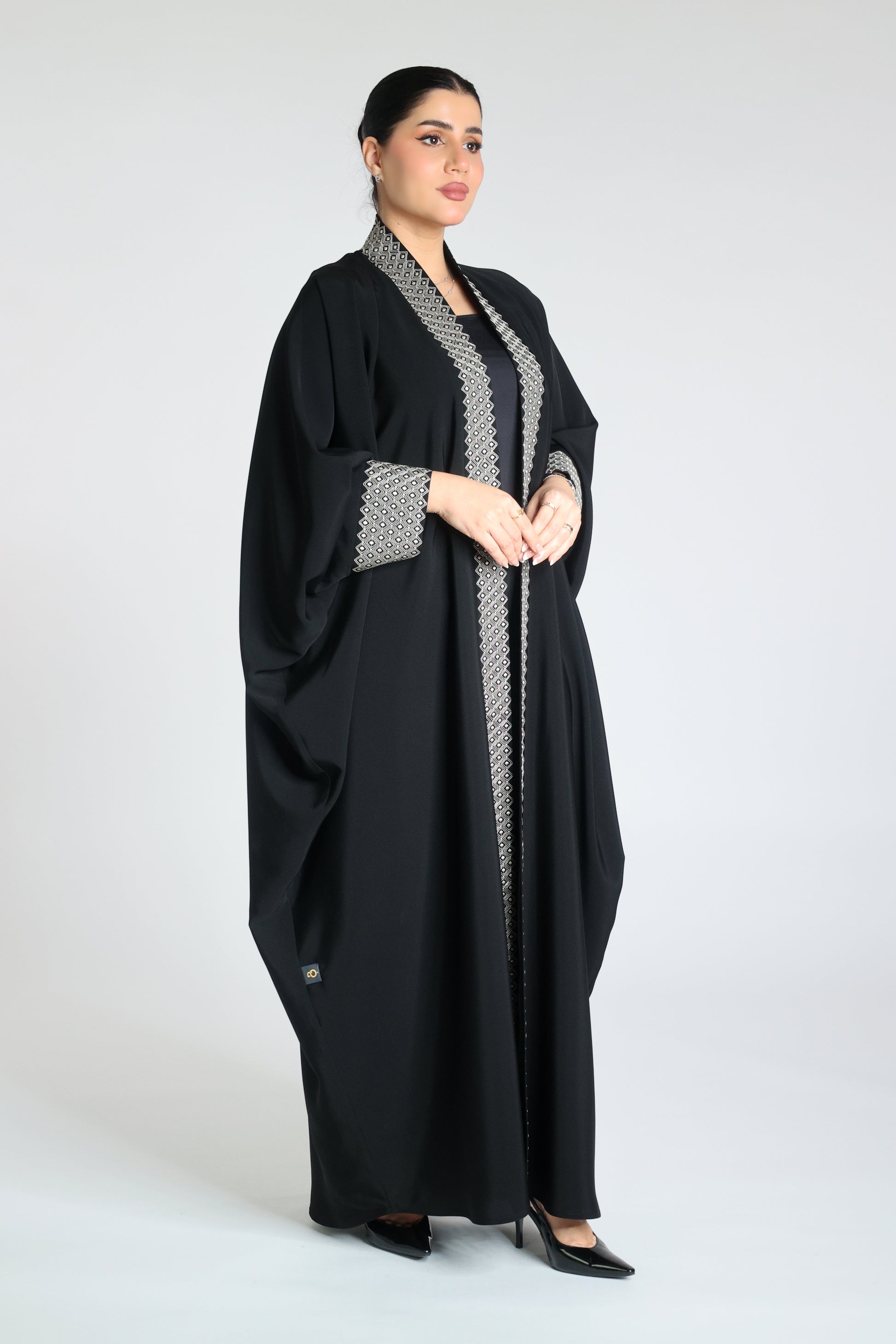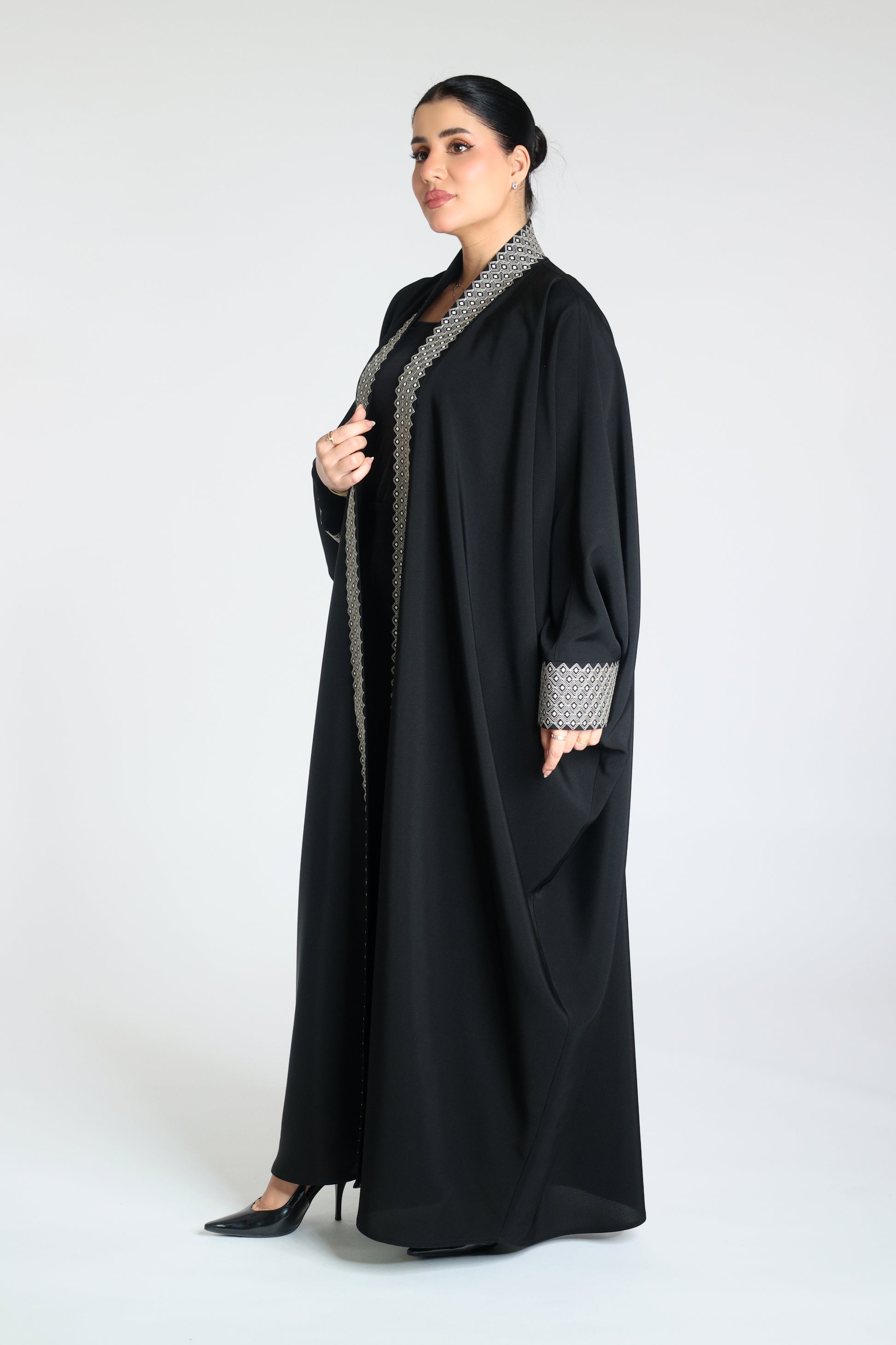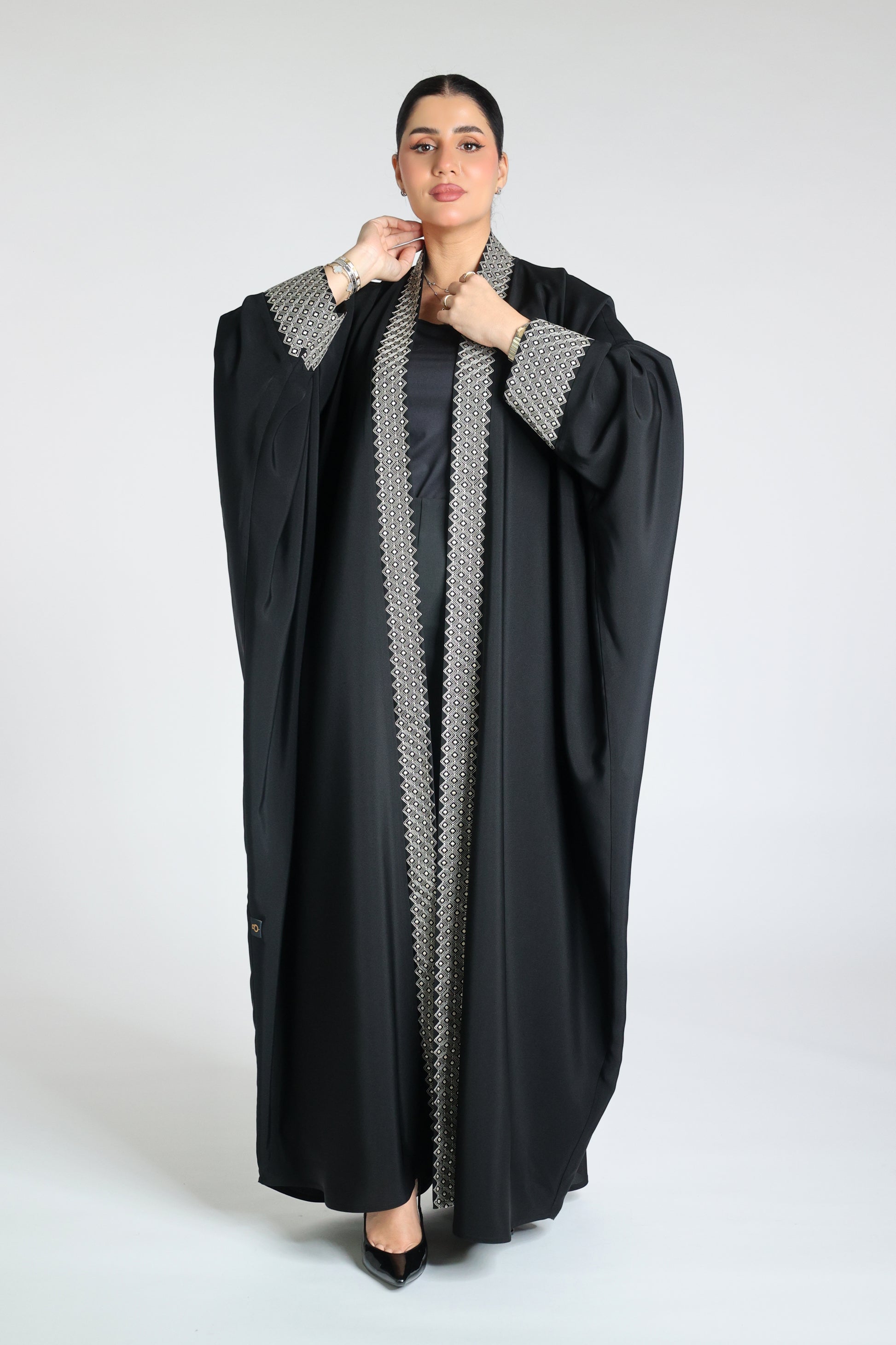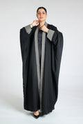 Abaya made from original Japanese soalon fabric in black bisht style, open, with embroidery on the front and sleeves in beige or black.