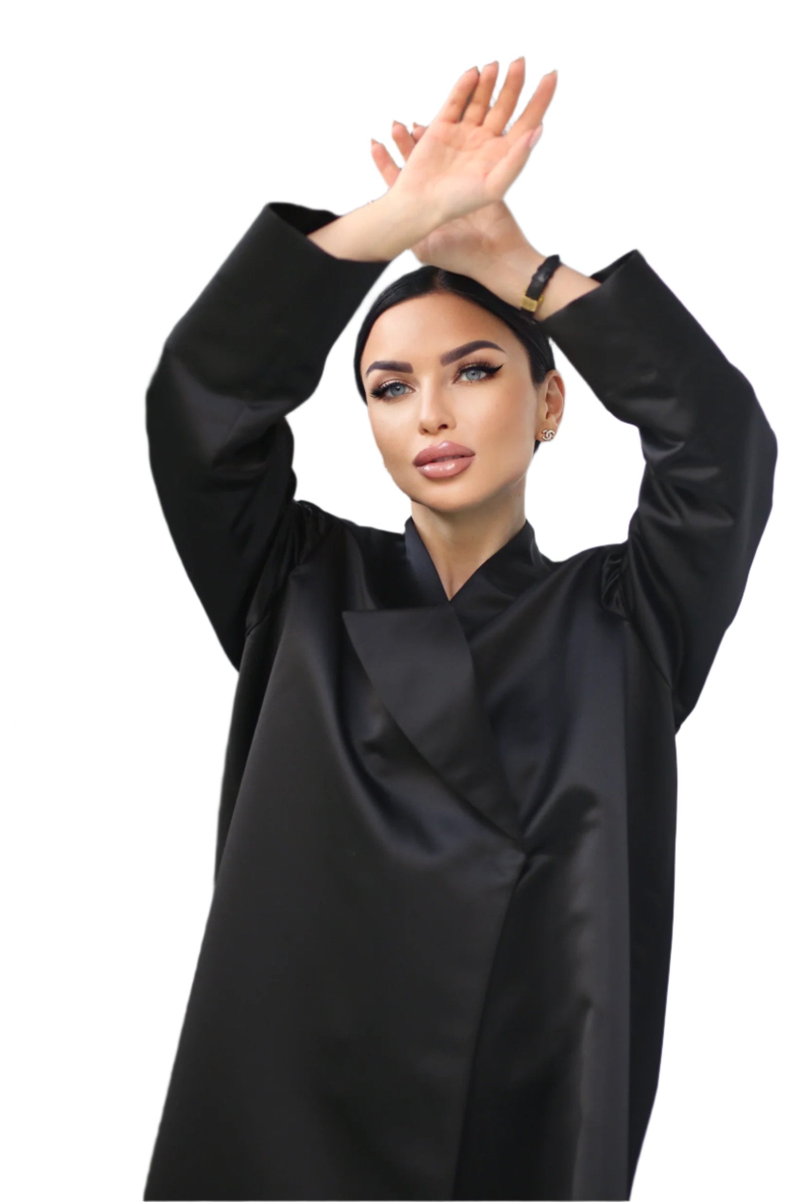 Blazer abaya is made from Special Bait-Hanayen Crepe. It has open front design and comes in Black. Designed in Kuwait and shipped worldwide.