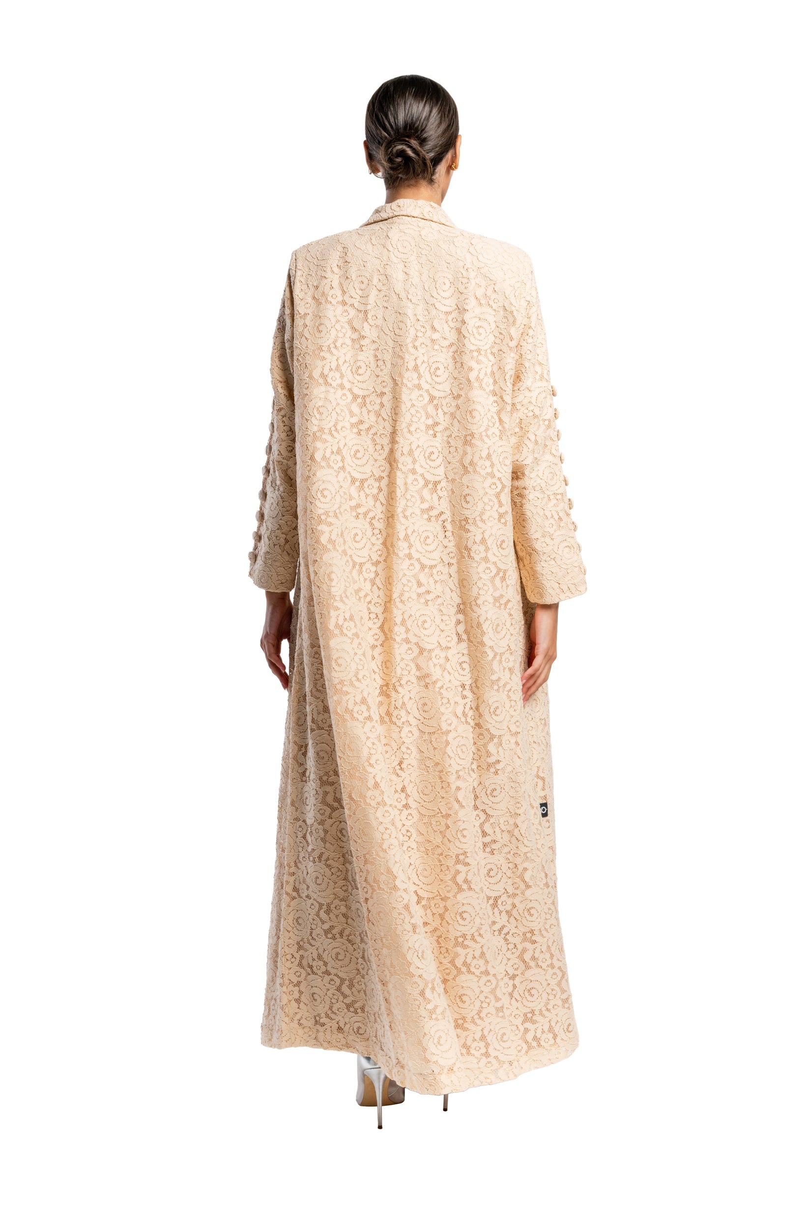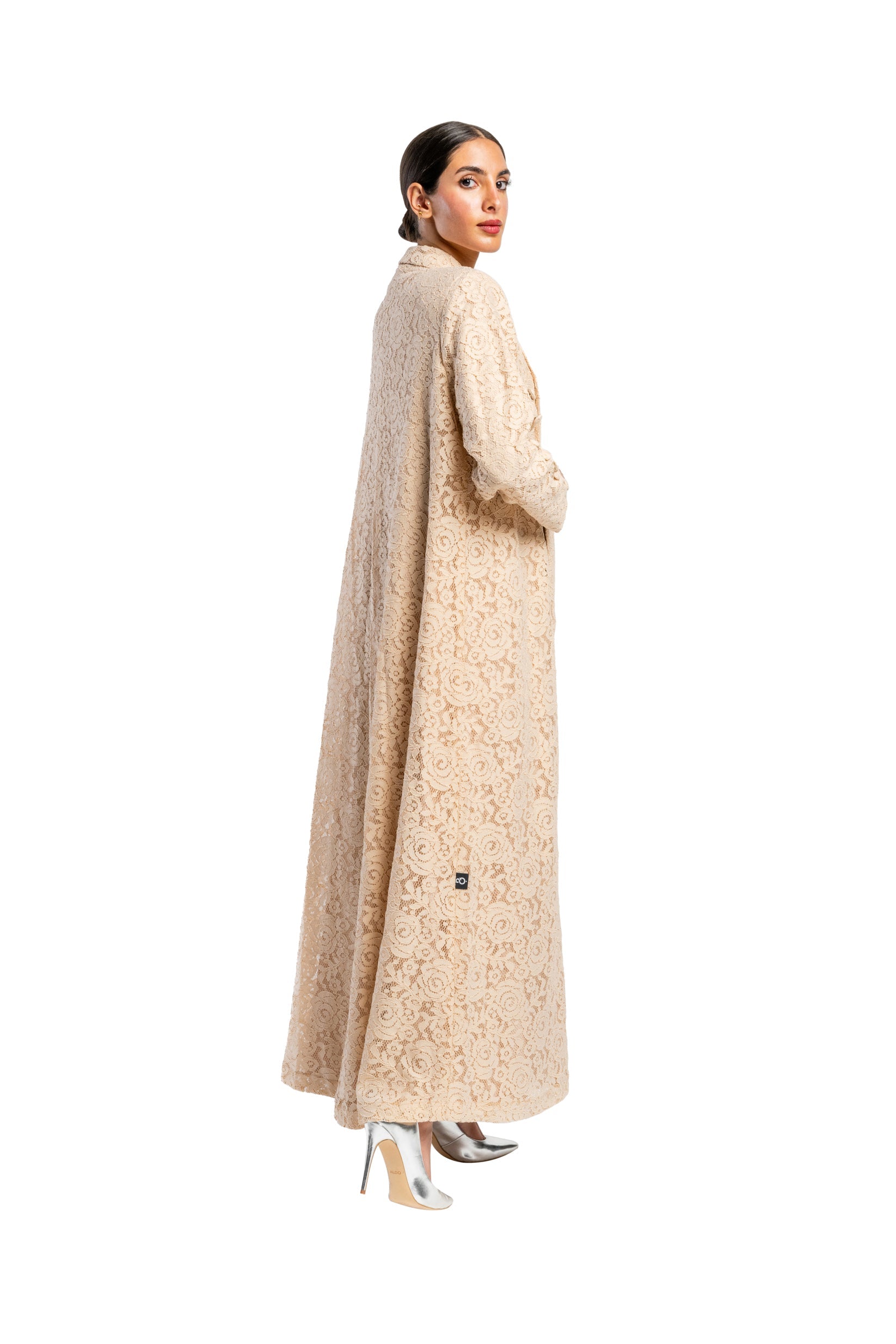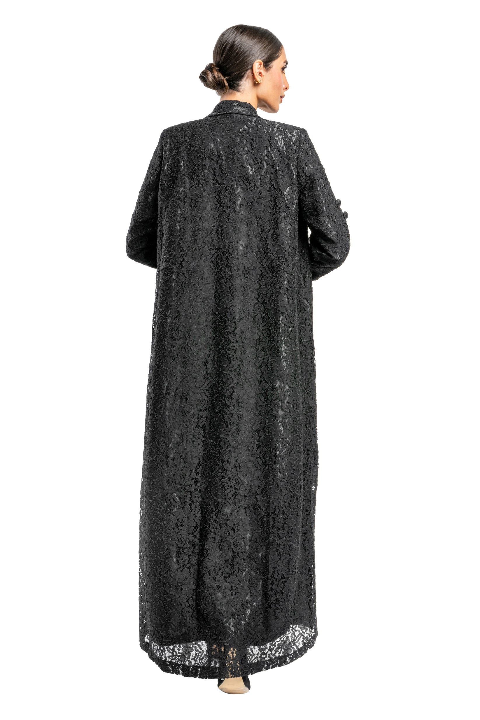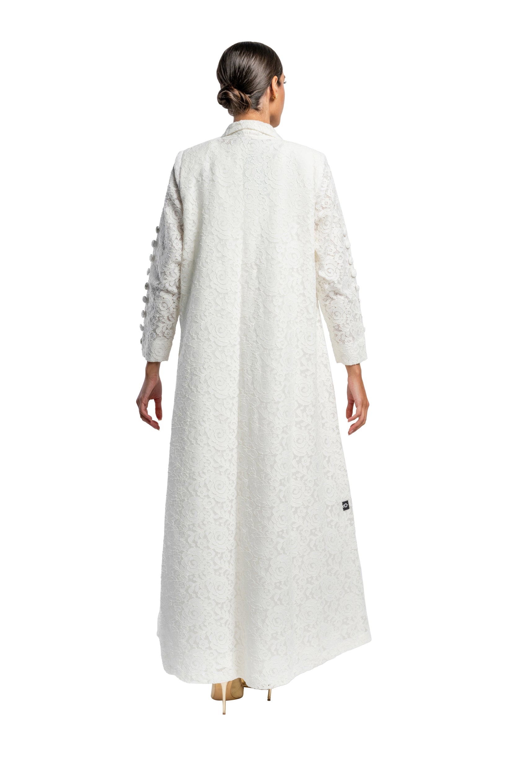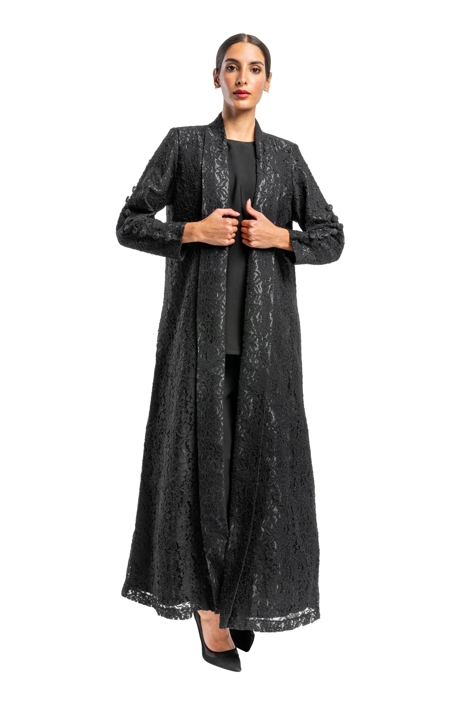 Dantel abaya is made from crepe. It comes in Black, White and Pink. Designed in Kuwait and shipped worldwide.