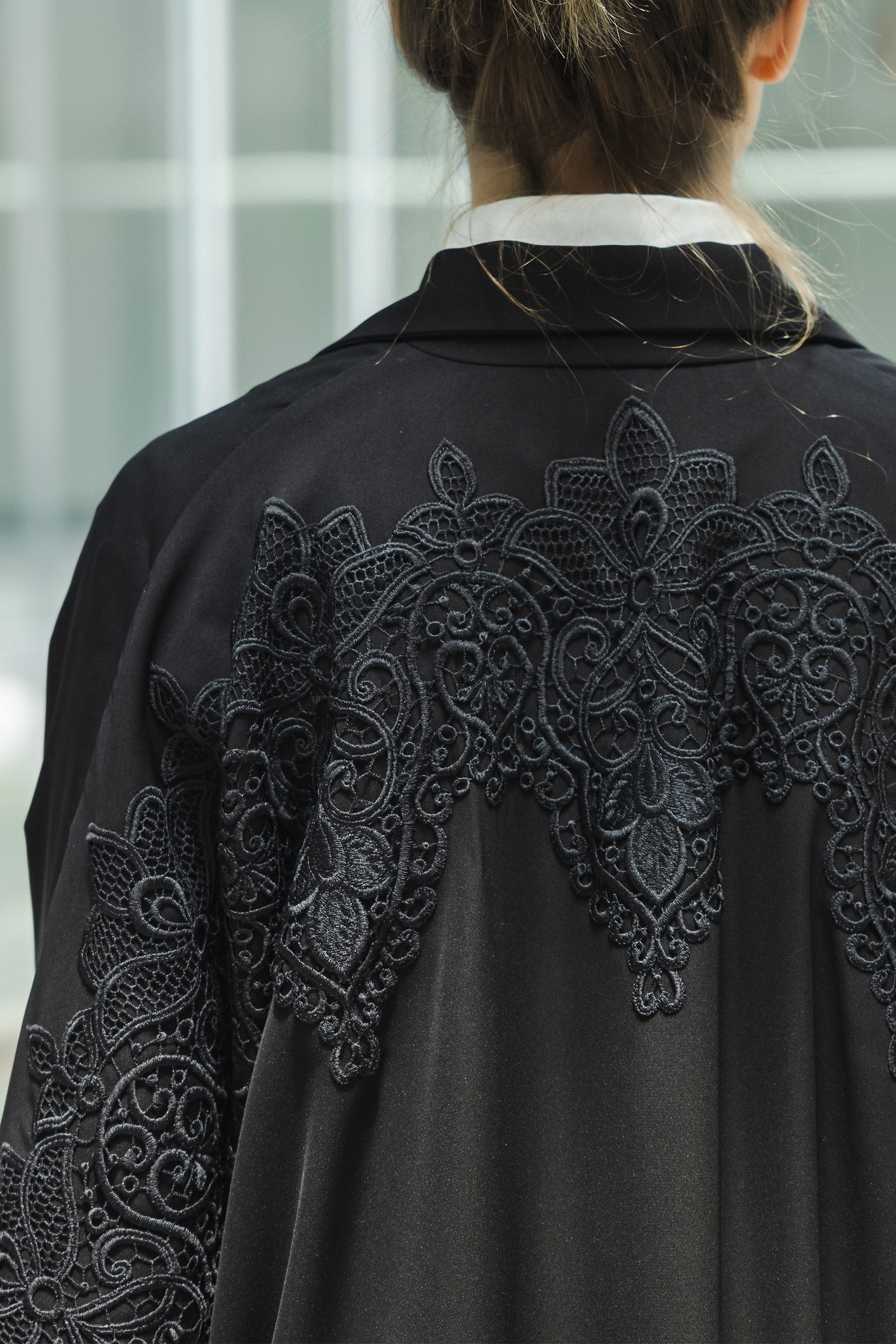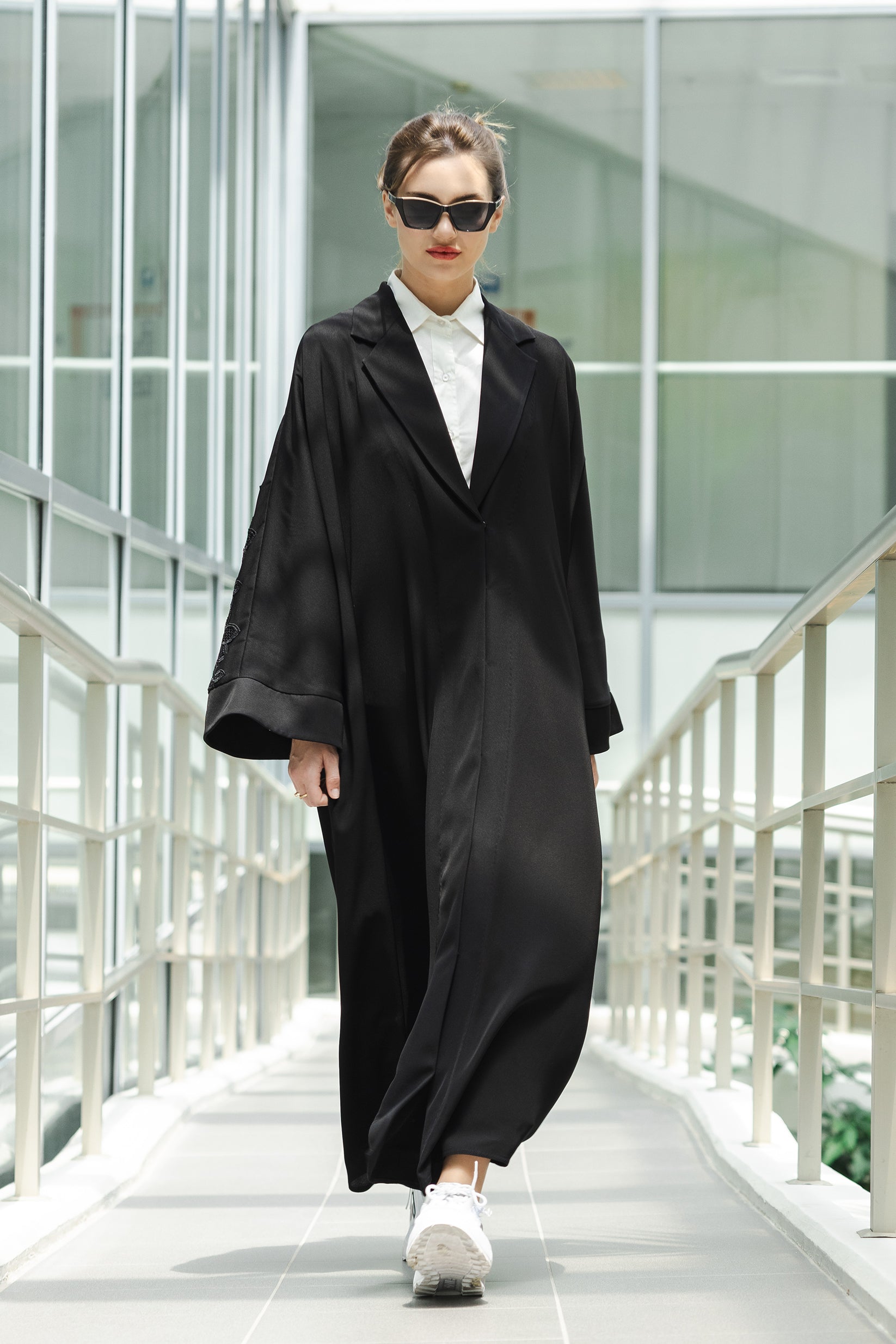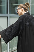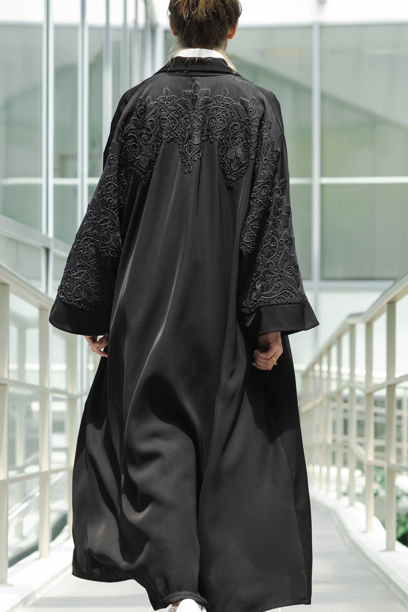 Dentelle abaya is made from crepe. It comes in Black. Designed in Kuwait and shipped worldwide.