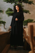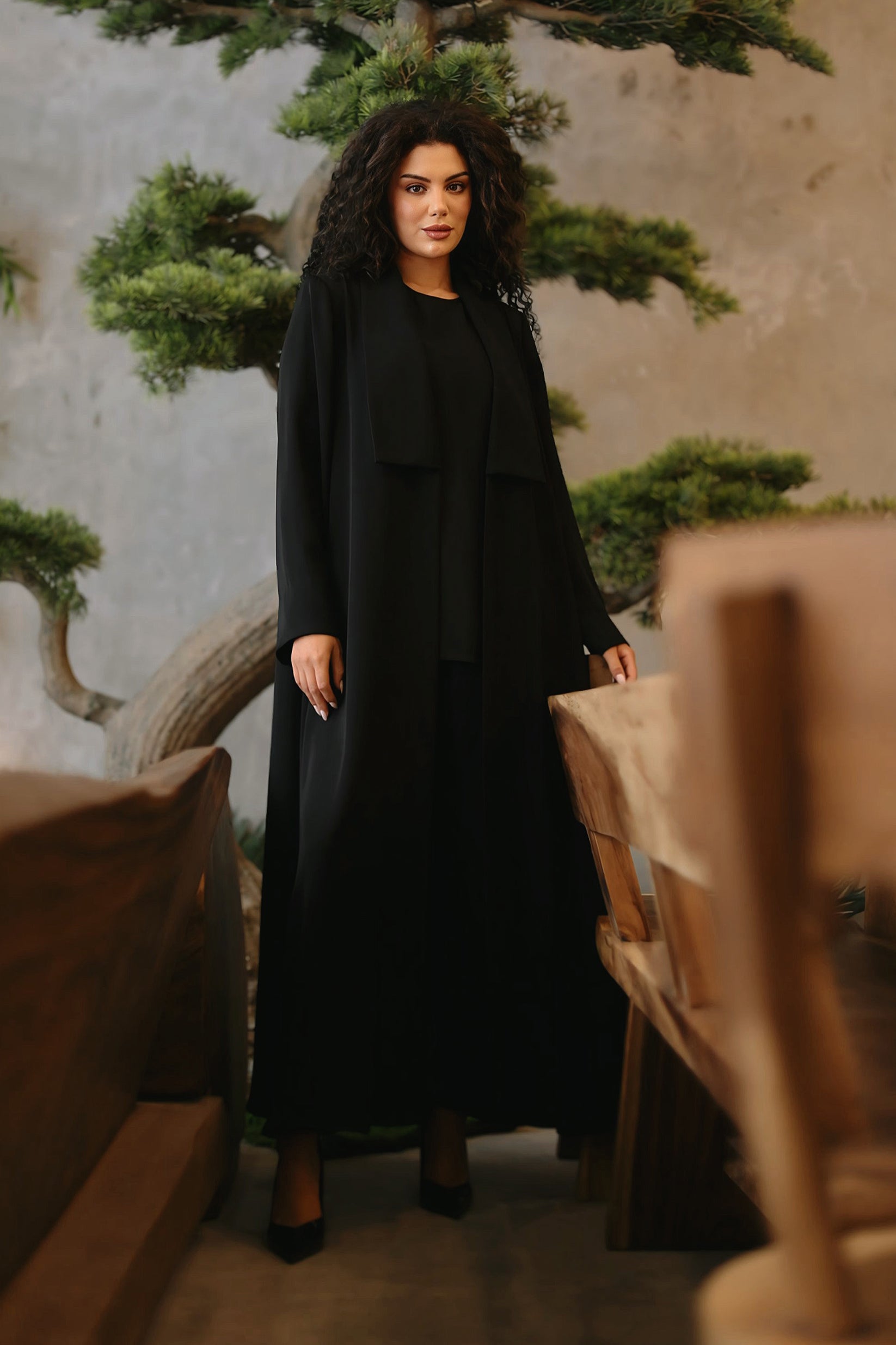 Crepe abaya is made from crepe. It has open front design and comes in Black. Designed in Kuwait and shipped worldwide.