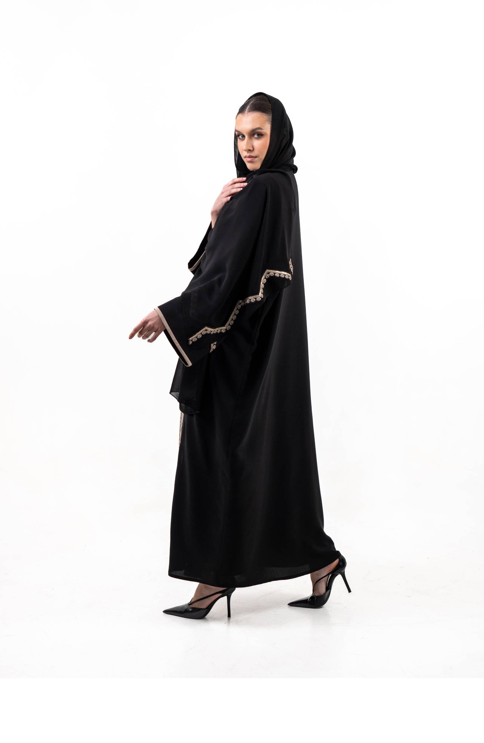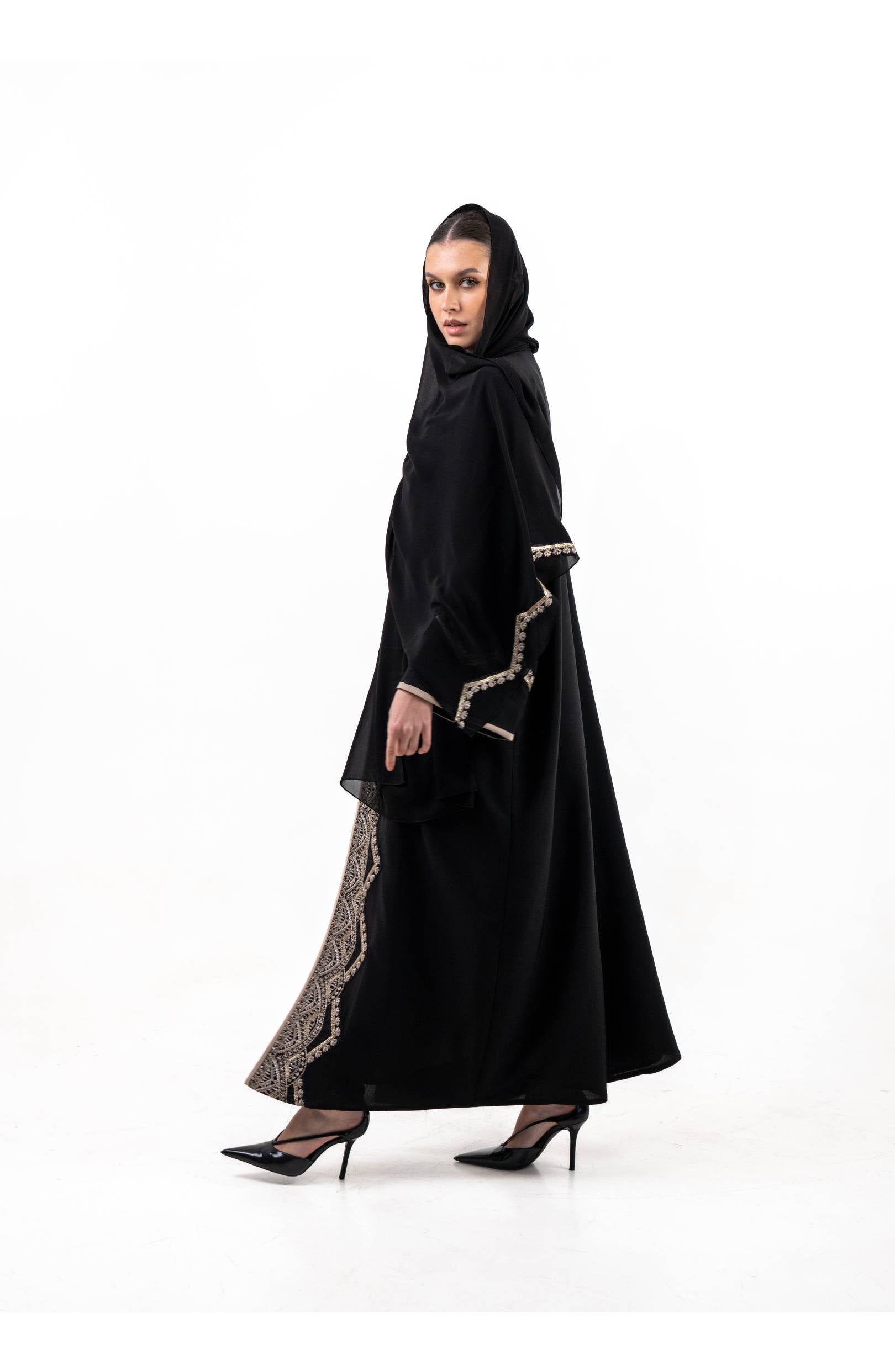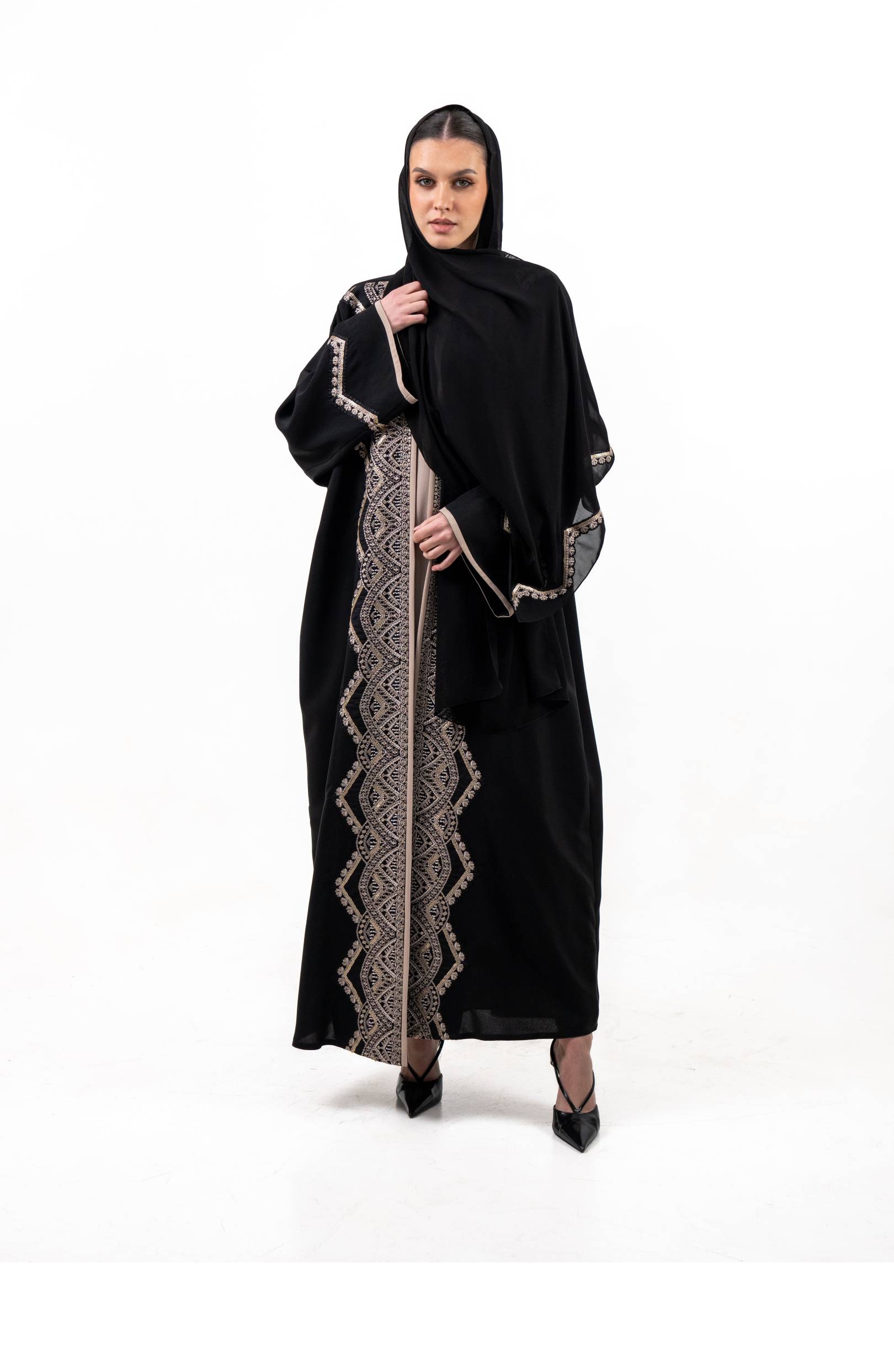 Embroidered abaya is made from soalon. It has open front design and embroidery. Its comes in Black. Designed in Kuwait and shipped worldwide.