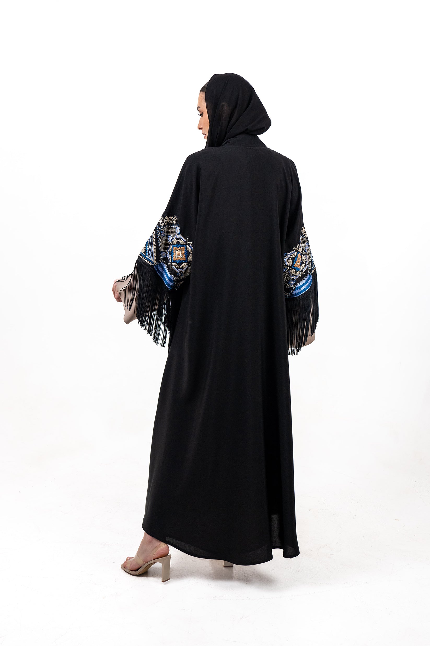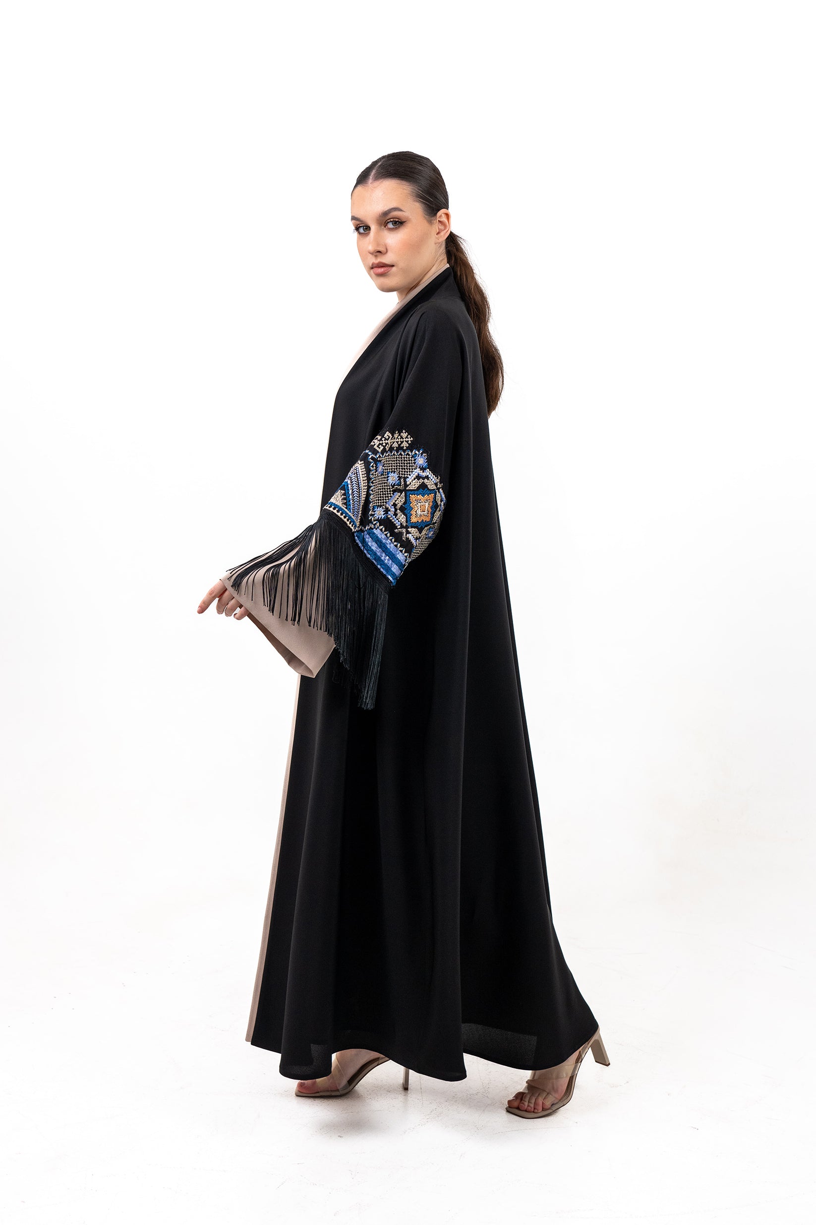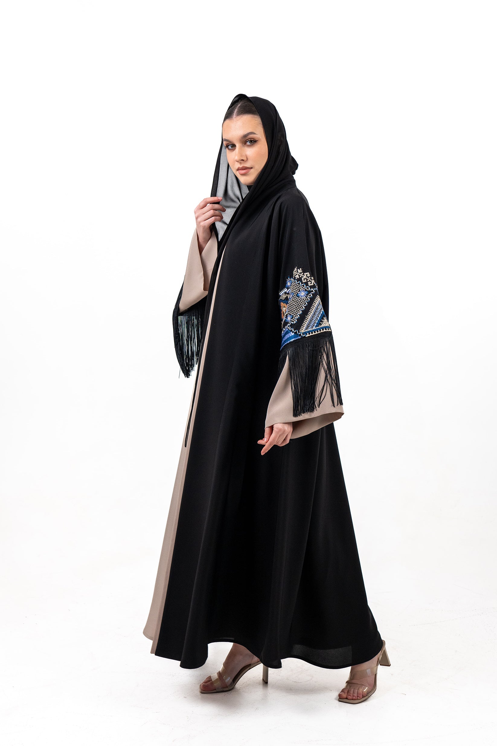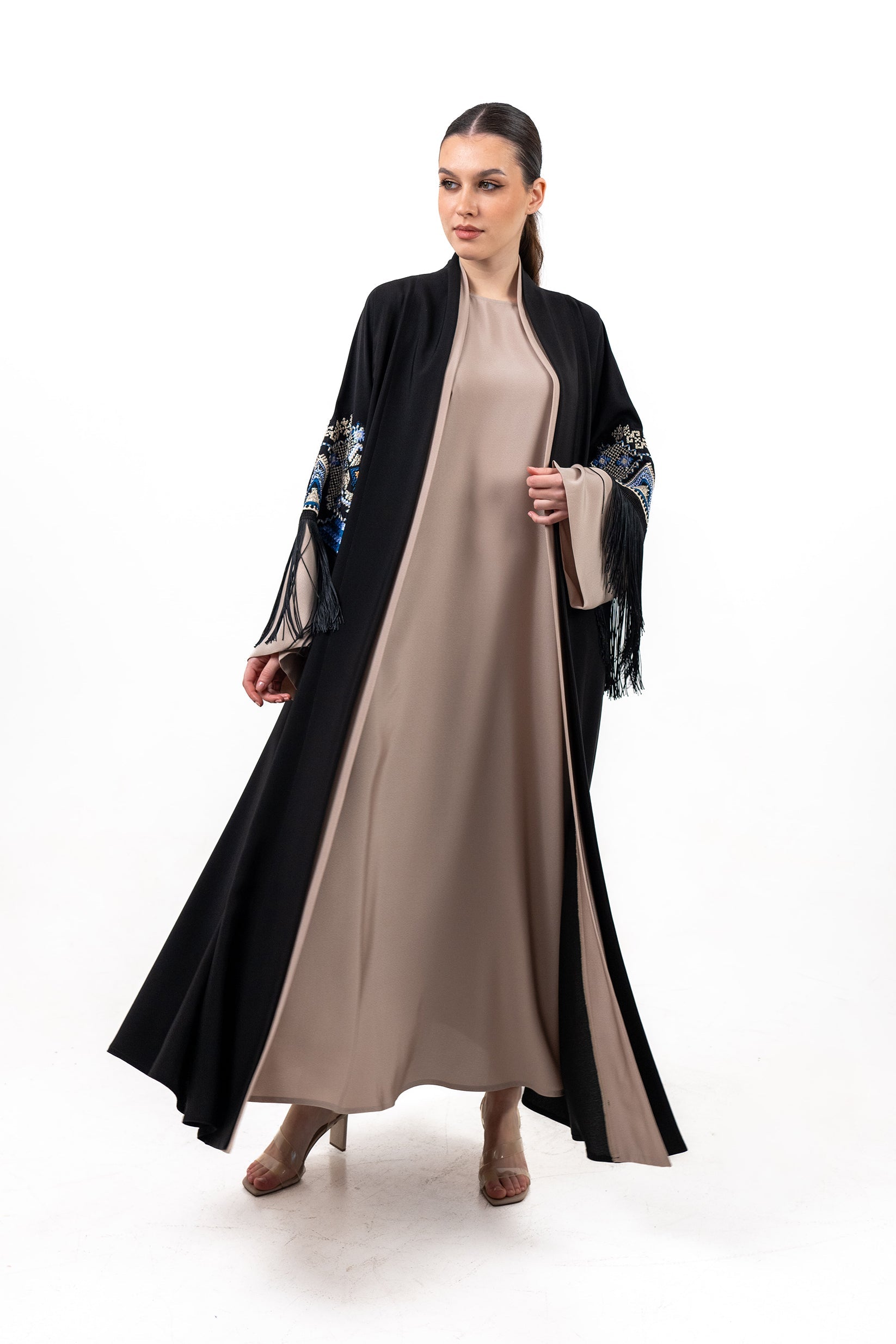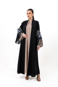 Embroidered abaya is made from soalon. It has open front design and embroidery and comes in Black. Designed in Kuwait and shipped worldwide.