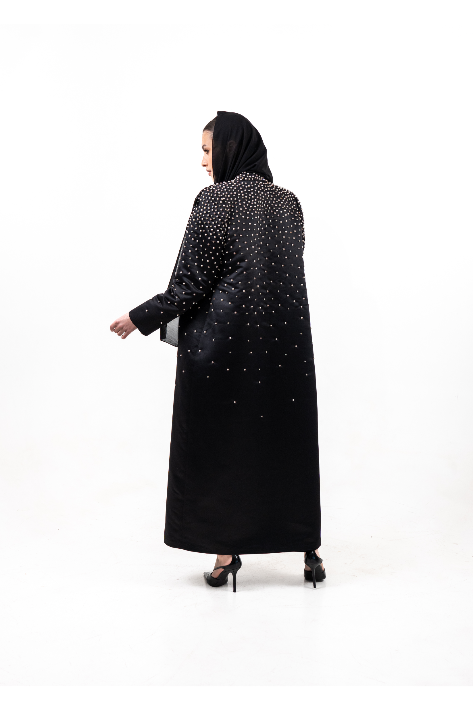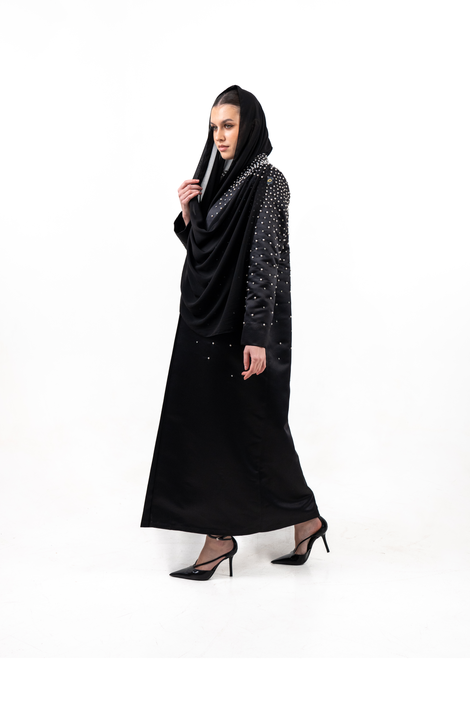 Embroidered satin abaya is made from Special Bait Hanayen Crepe. It has open front design and embroidery and comes in Black. Designed in Kuwait and shipped worldwide.