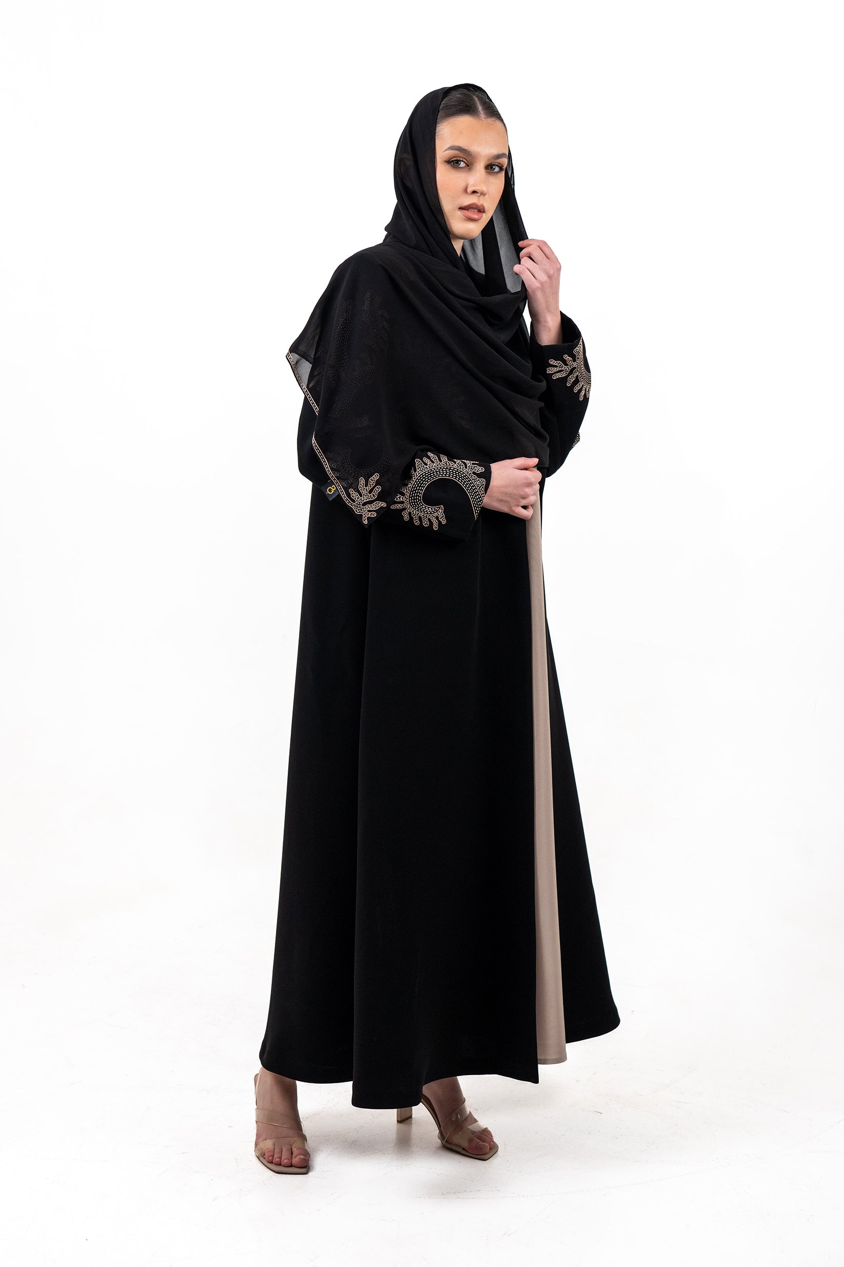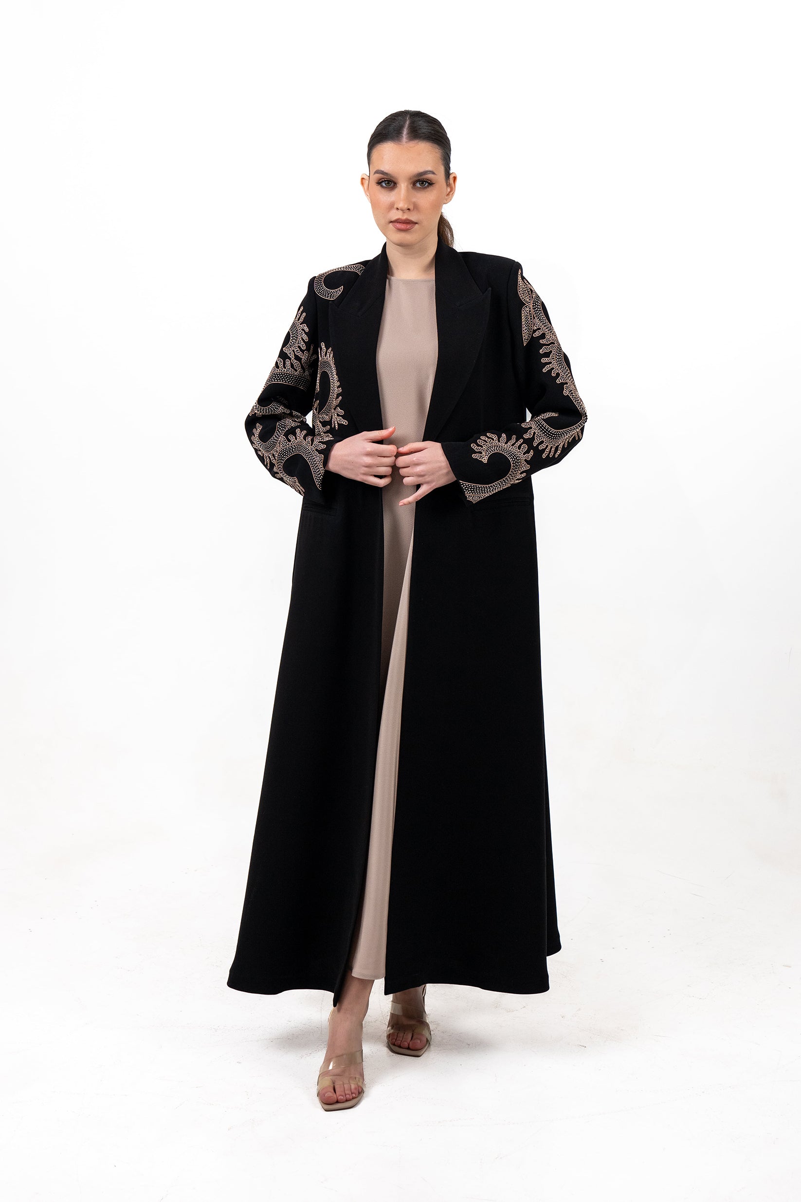 Embroidered abaya is made from Special Bait Hanayen Crepe. It has open front design and embroidery and comes in Black. Designed in Kuwait and shipped worldwide.