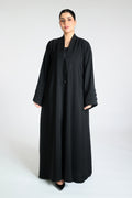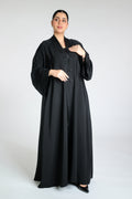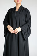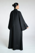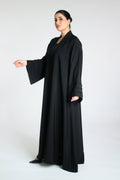 Abaya made from original Japanese soalon fabric in black flared style with layered soalon fabric on the sleeves; elegant and practical.