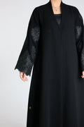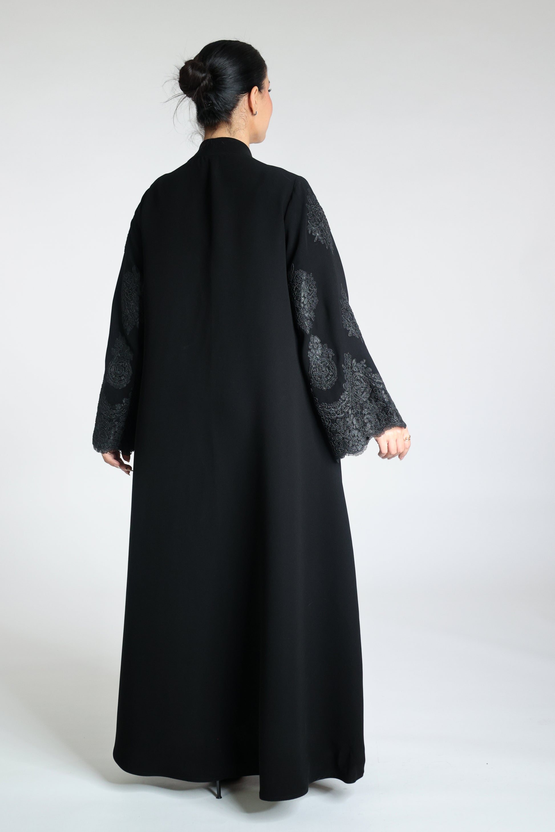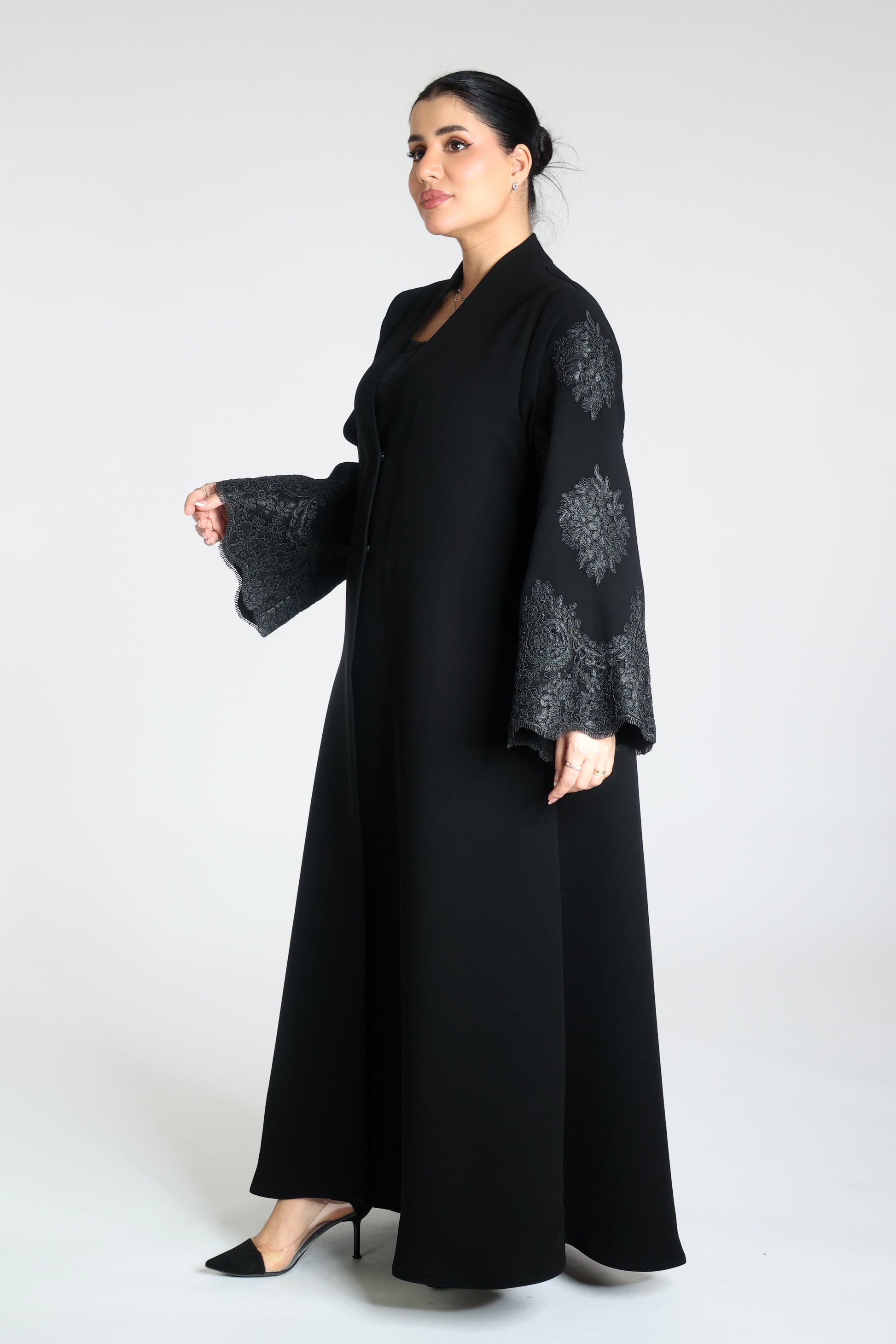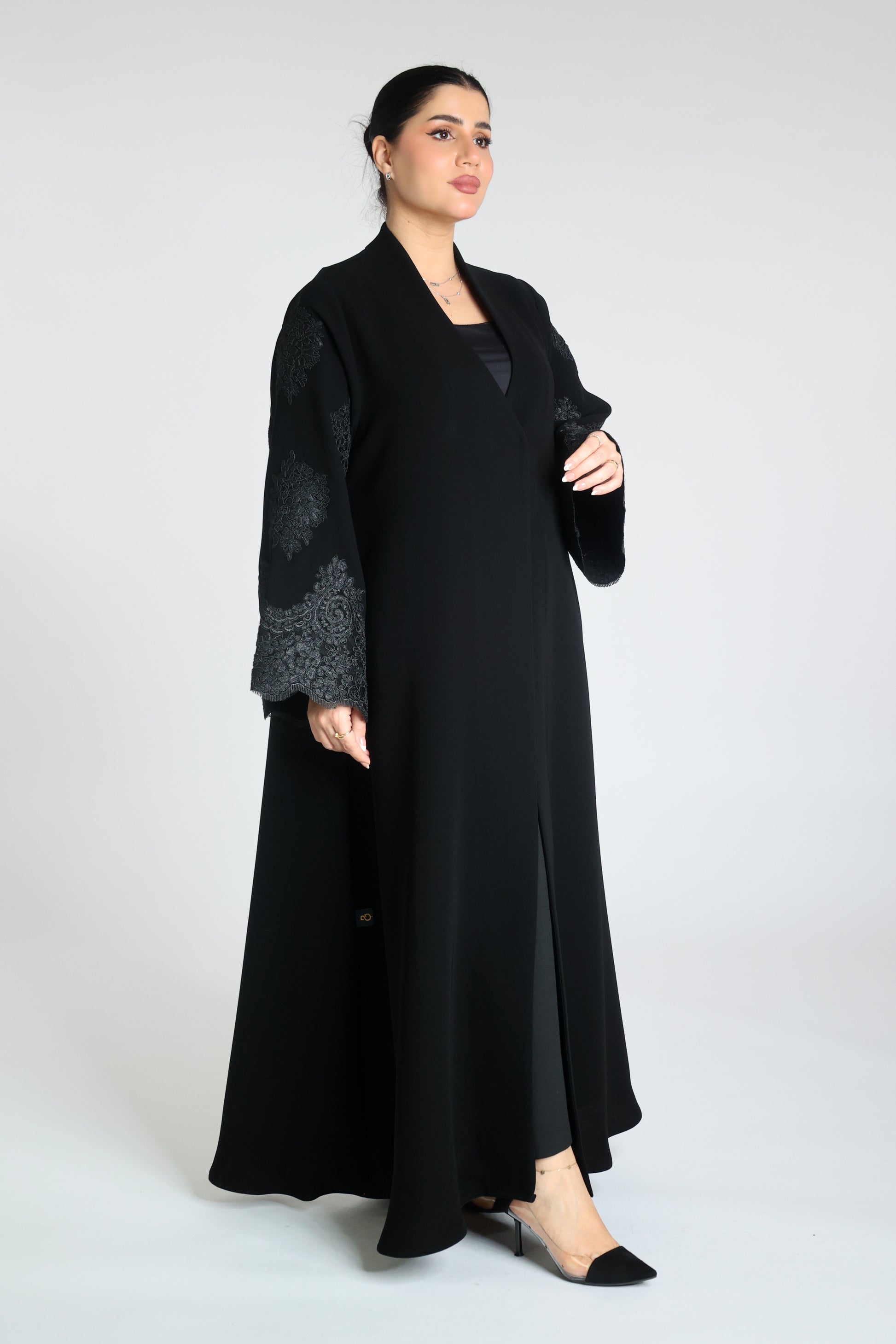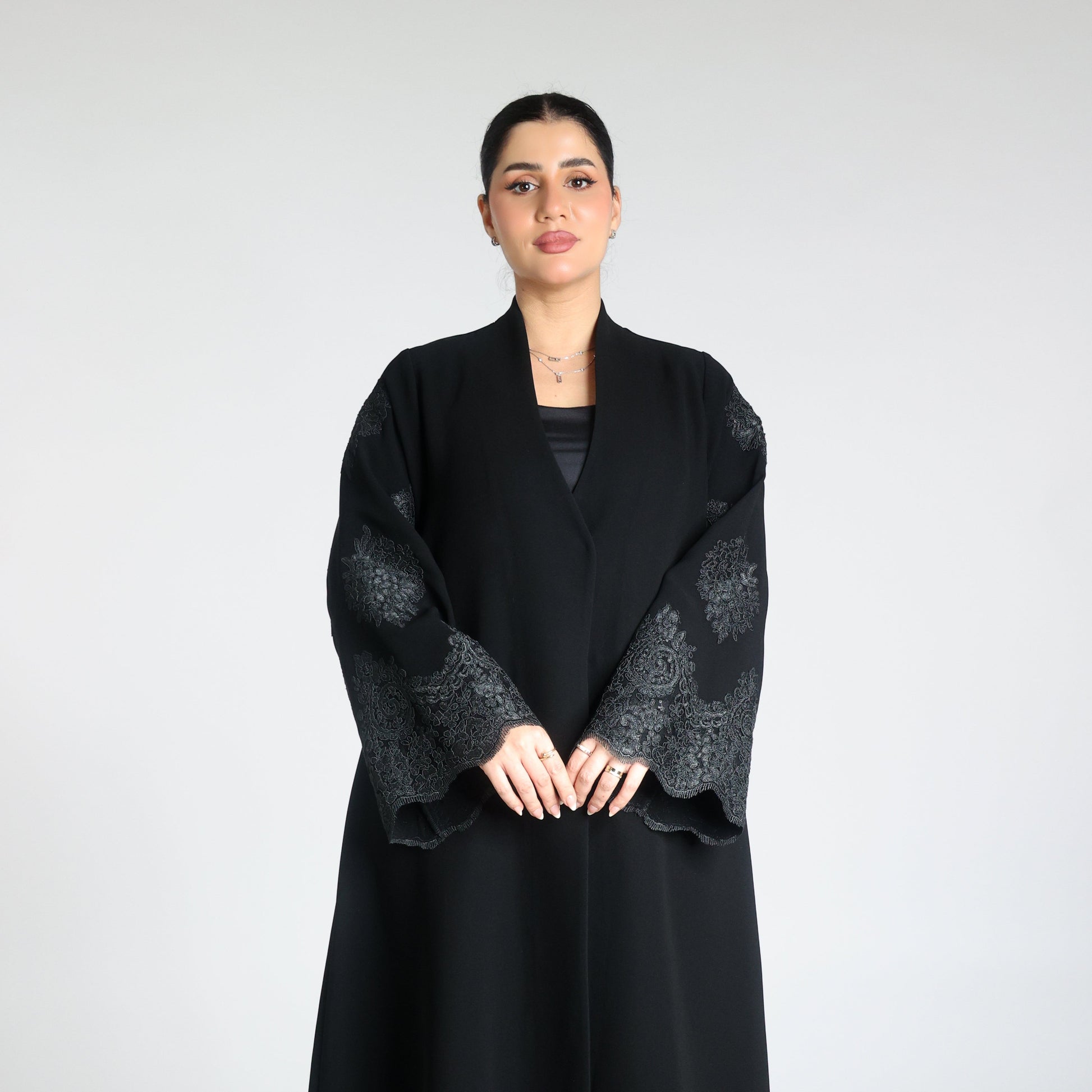 Abaya made of special Rolex fabric with French lace and handwork on the sleeves.