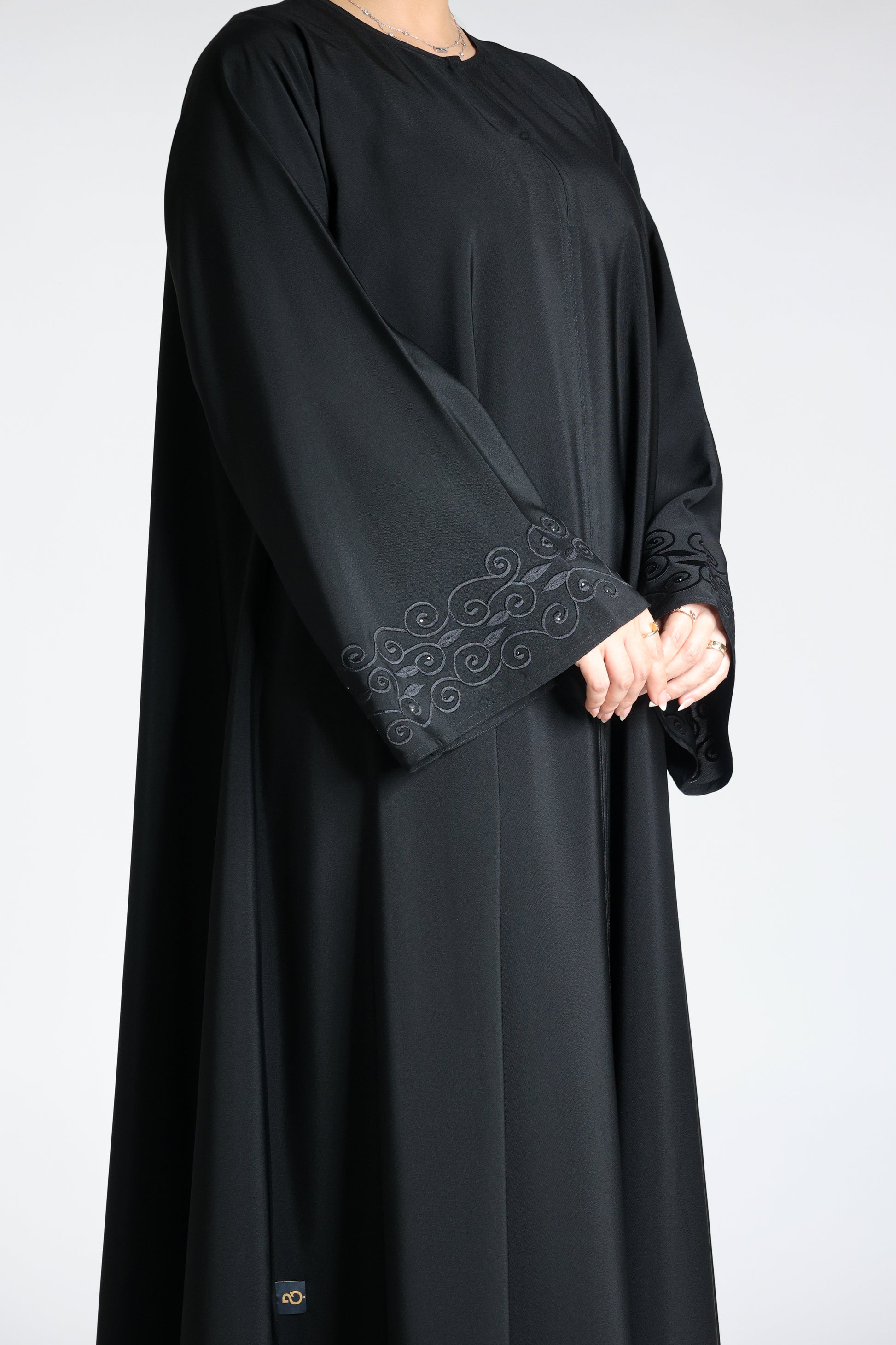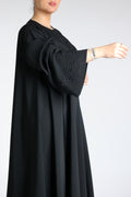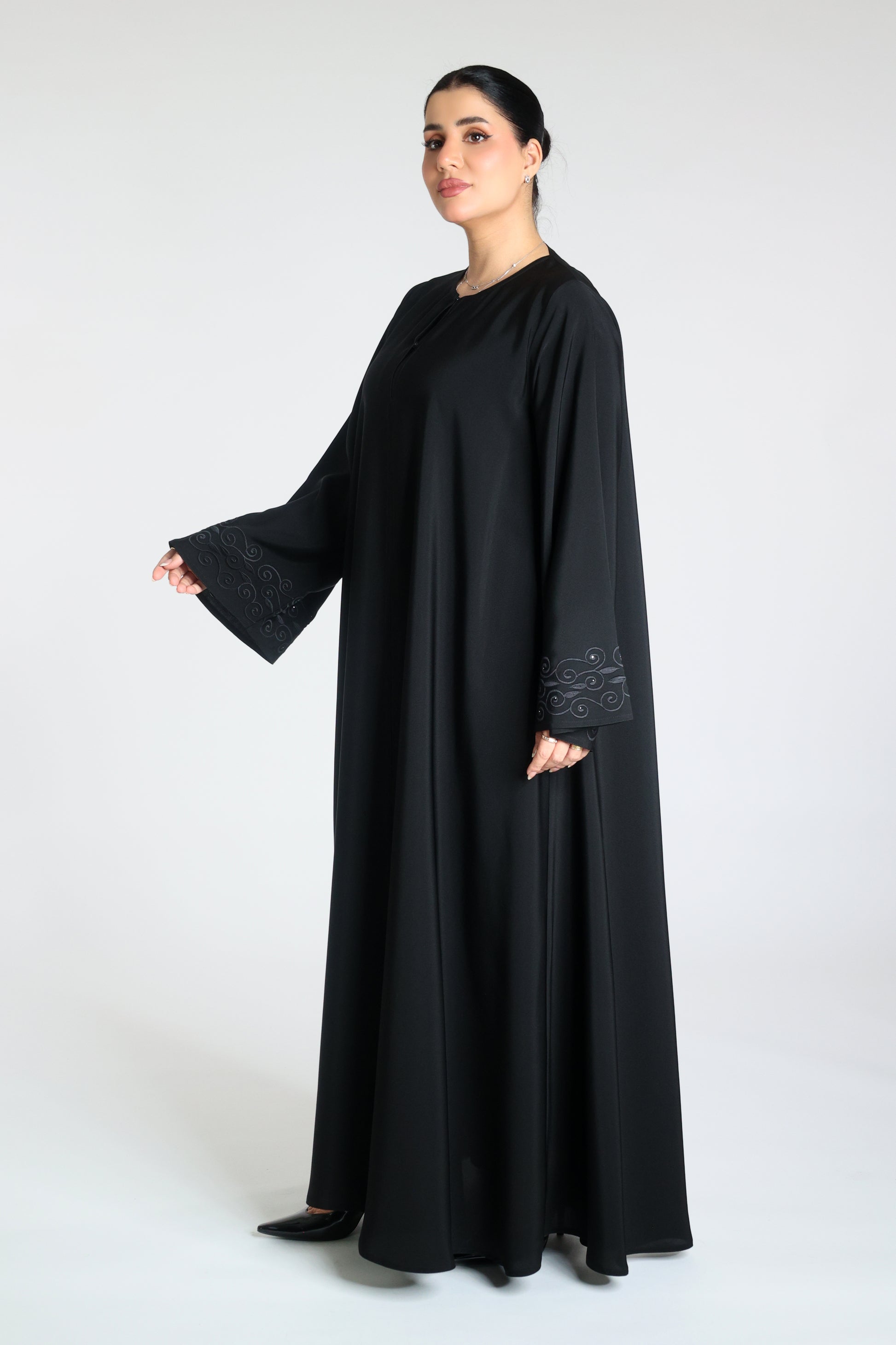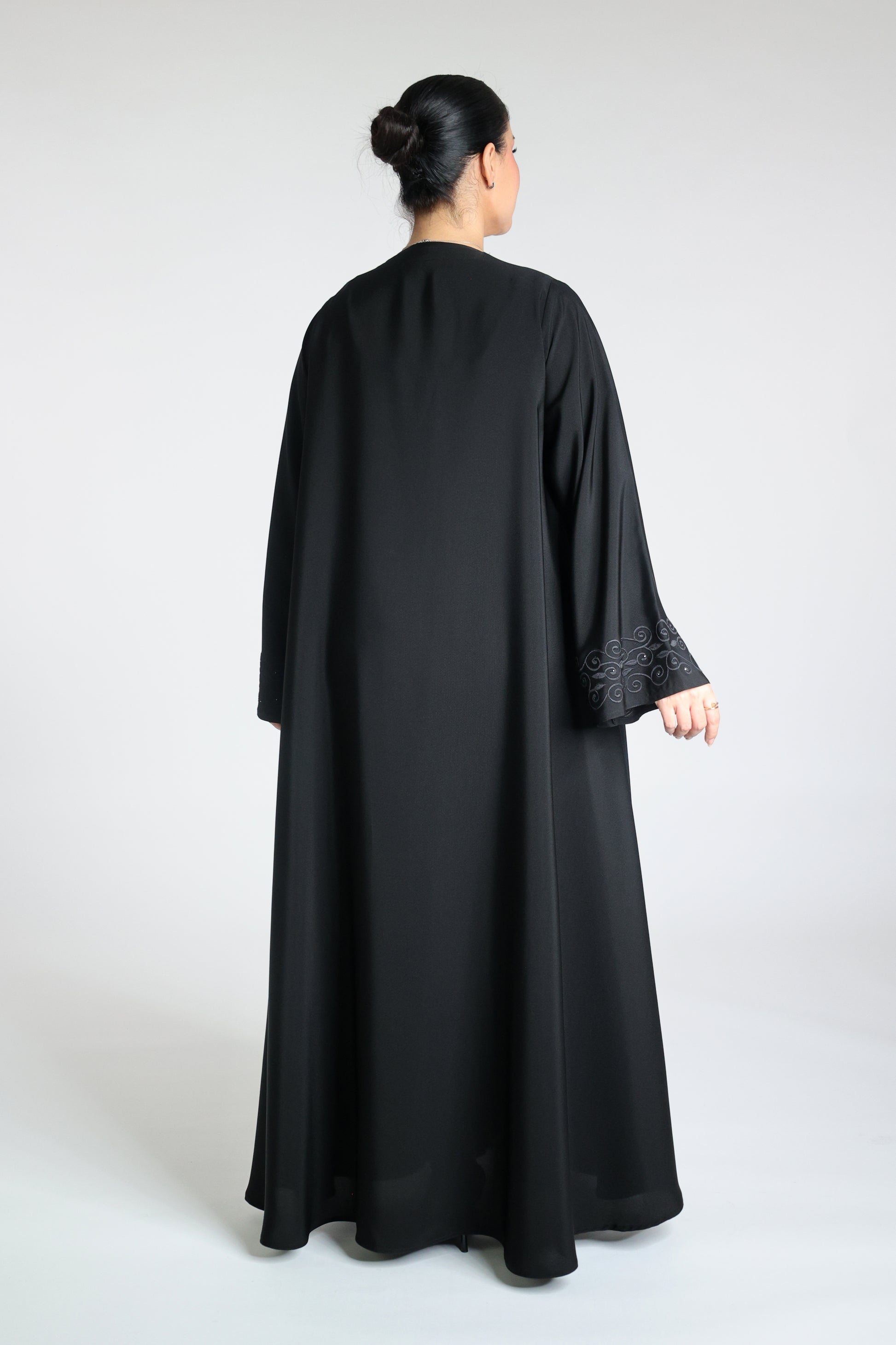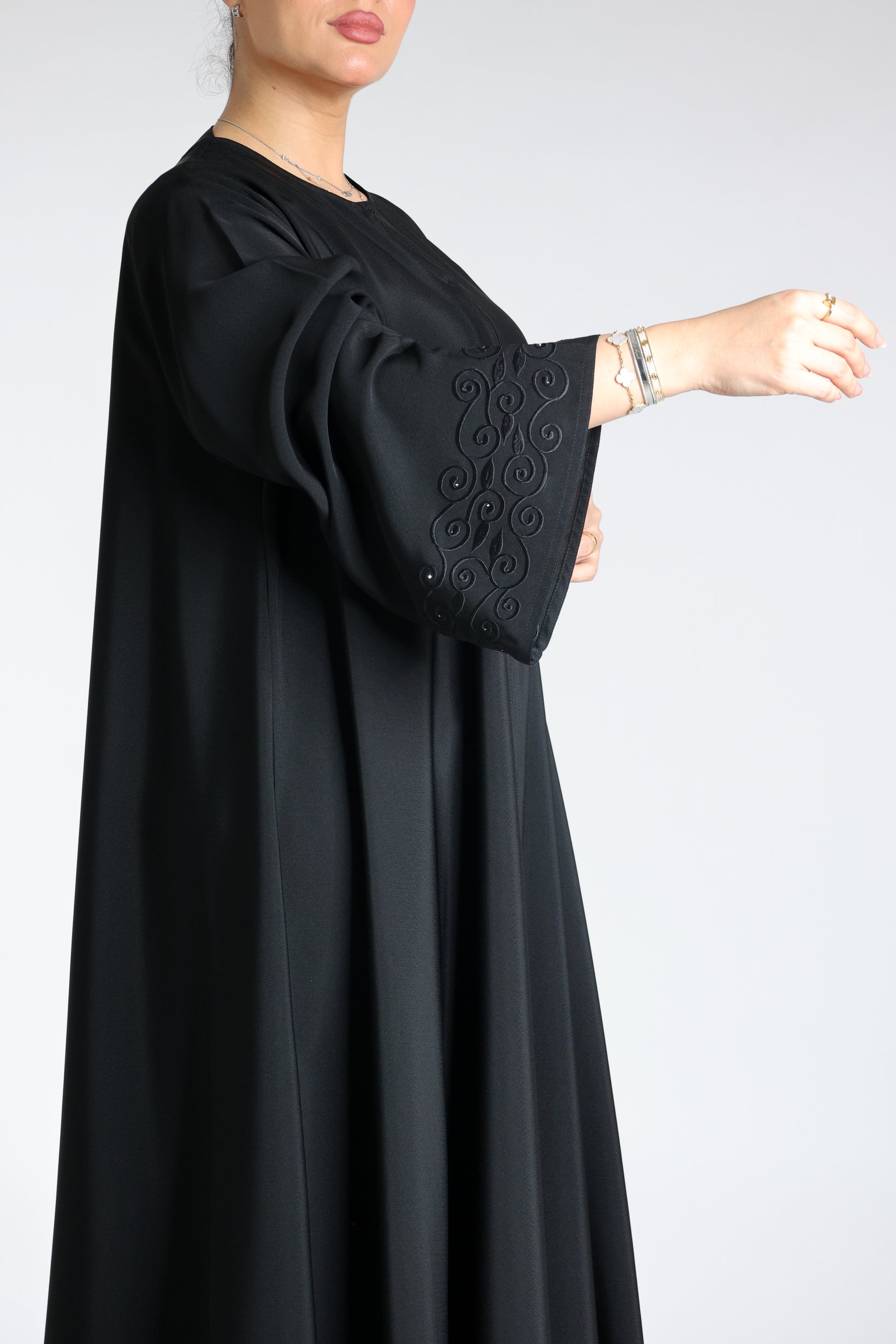 Abaya made from original Japanese soalon fabric in black flared style with black embroidery and Swarovski crystals on the sleeves; practical and elegant.