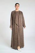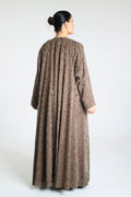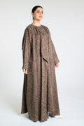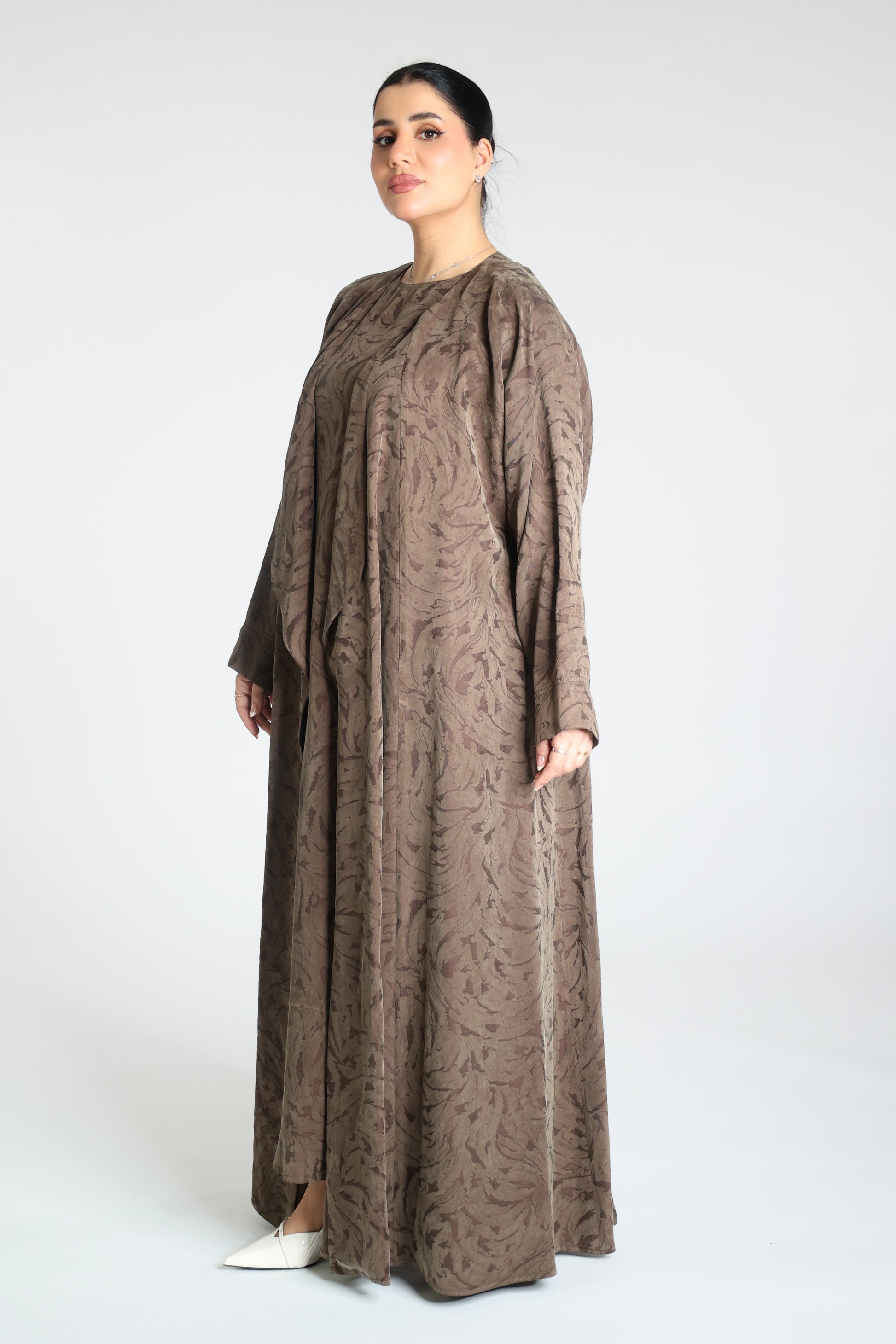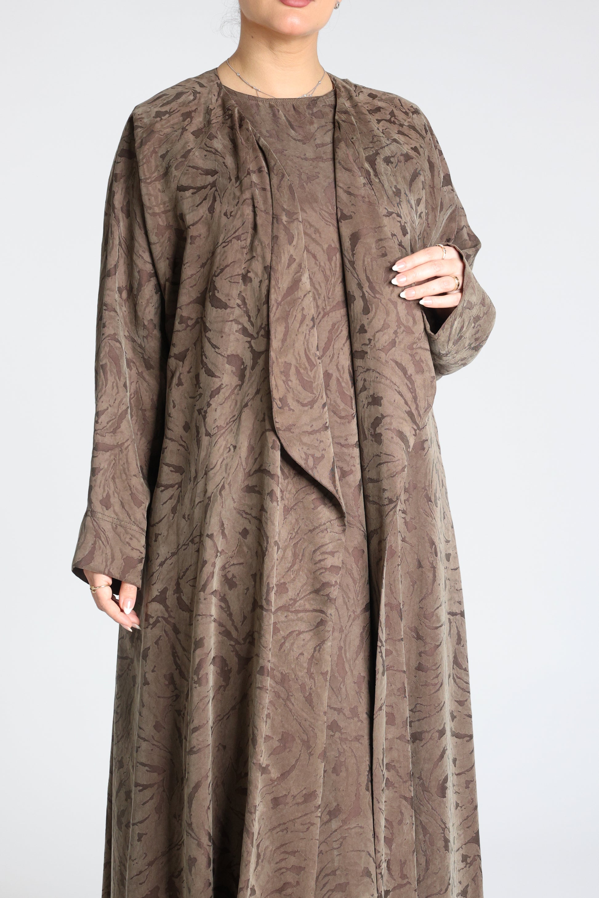 Abaya made from washed jacquard silk fabric patterned in brown, flared, open and in a one-size fit.