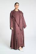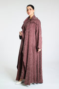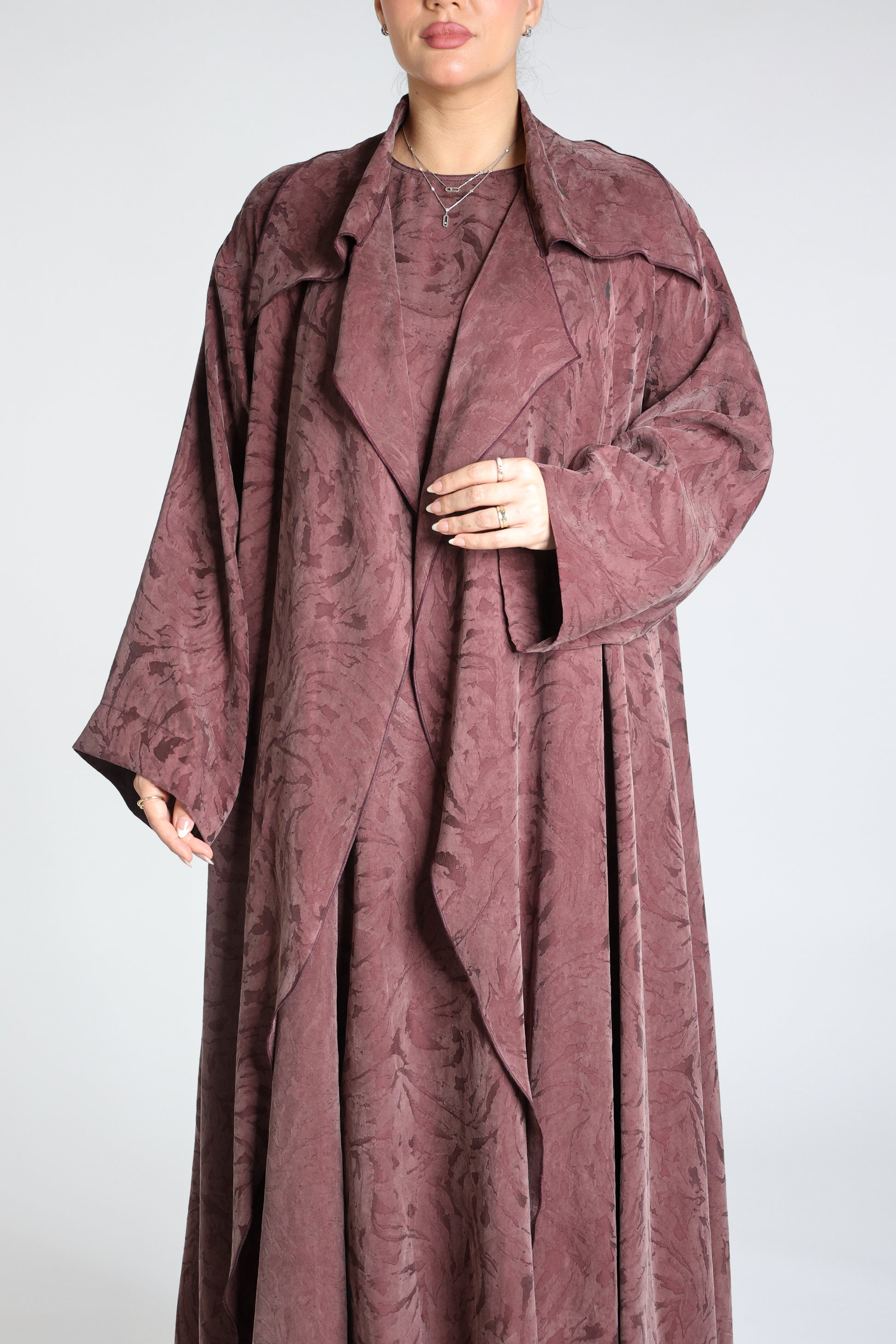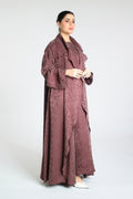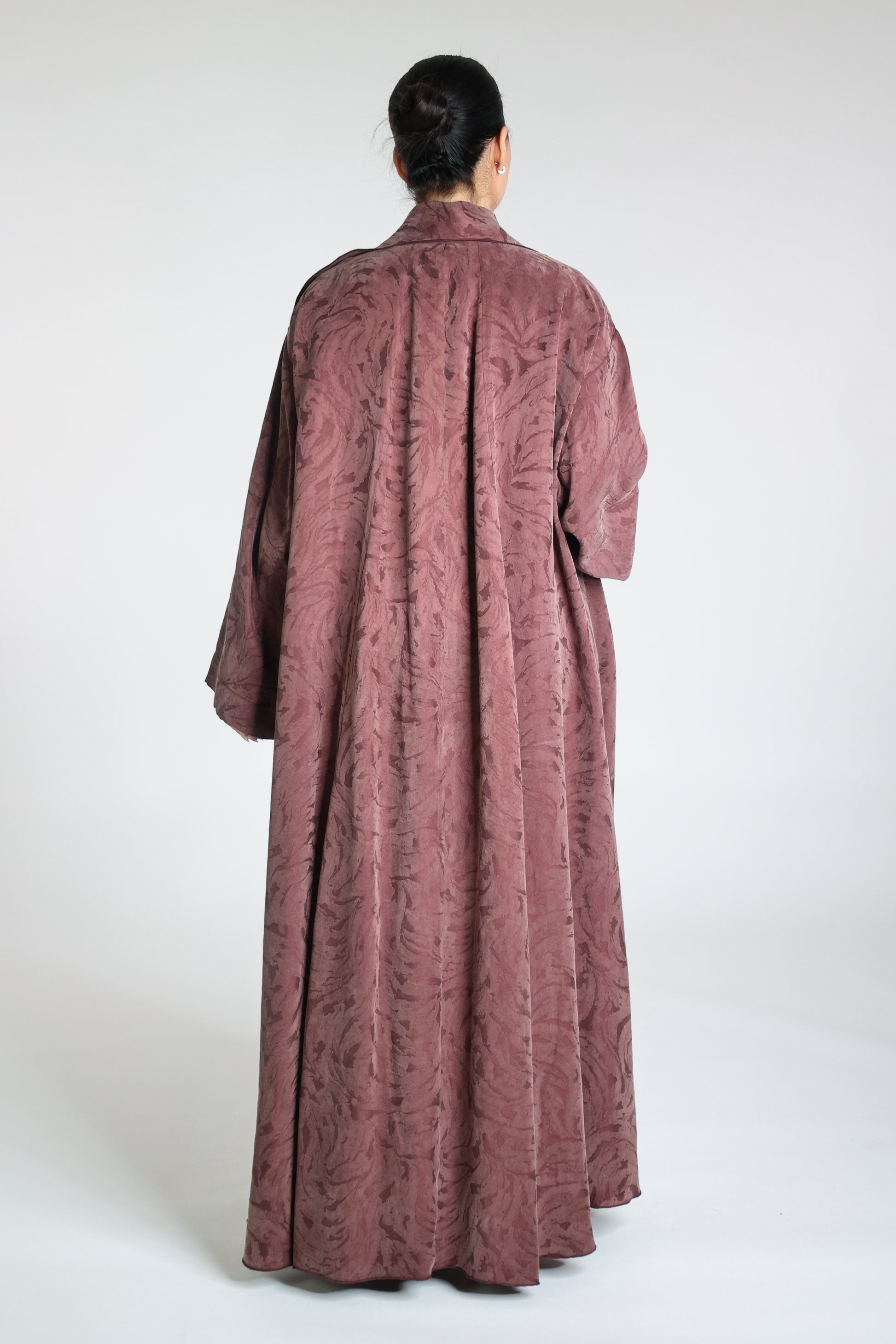 Abaya made from washed jacquard silk fabric in a light burgundy pattern with flared cuts, open and one-size fits all.