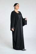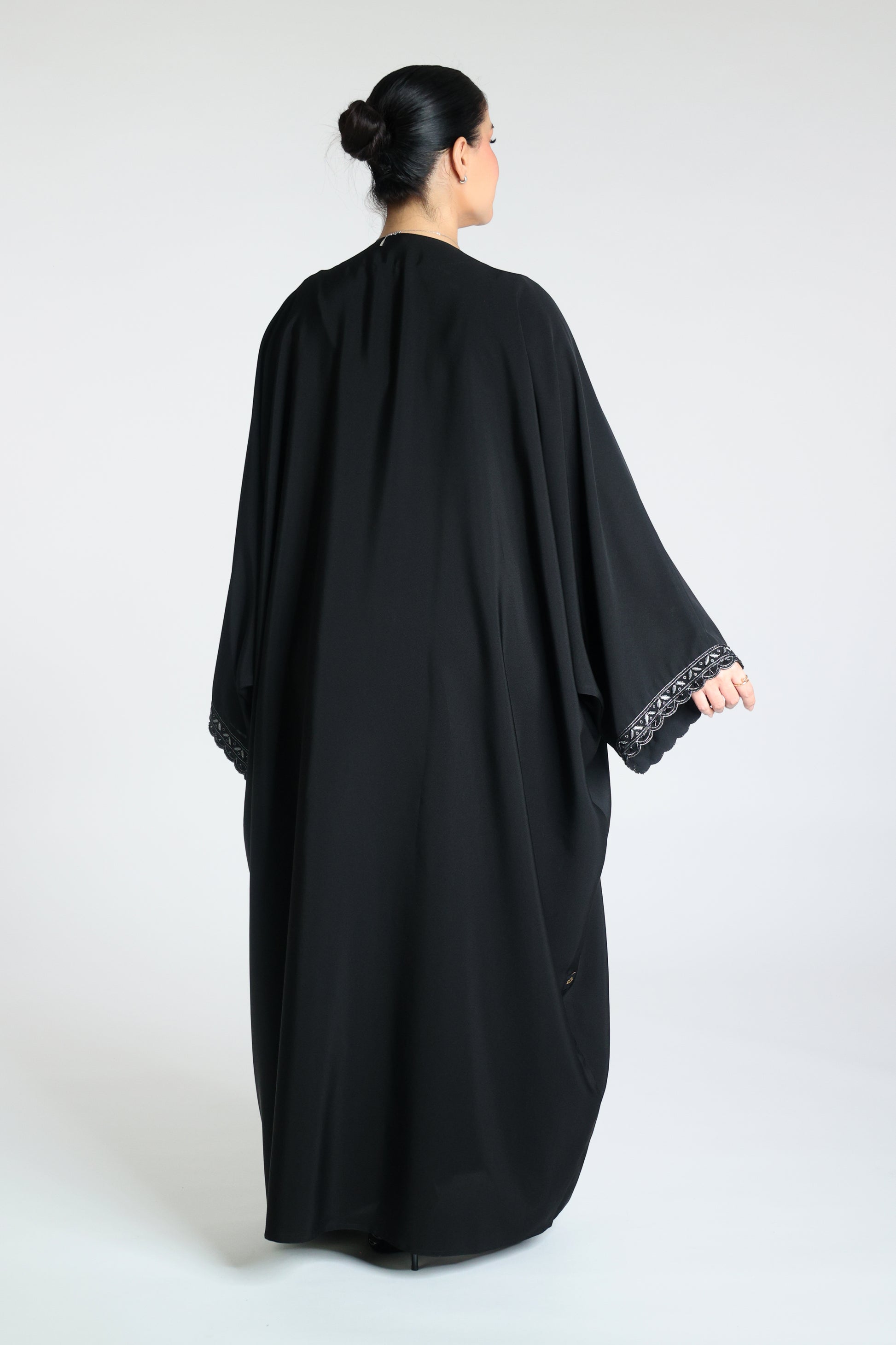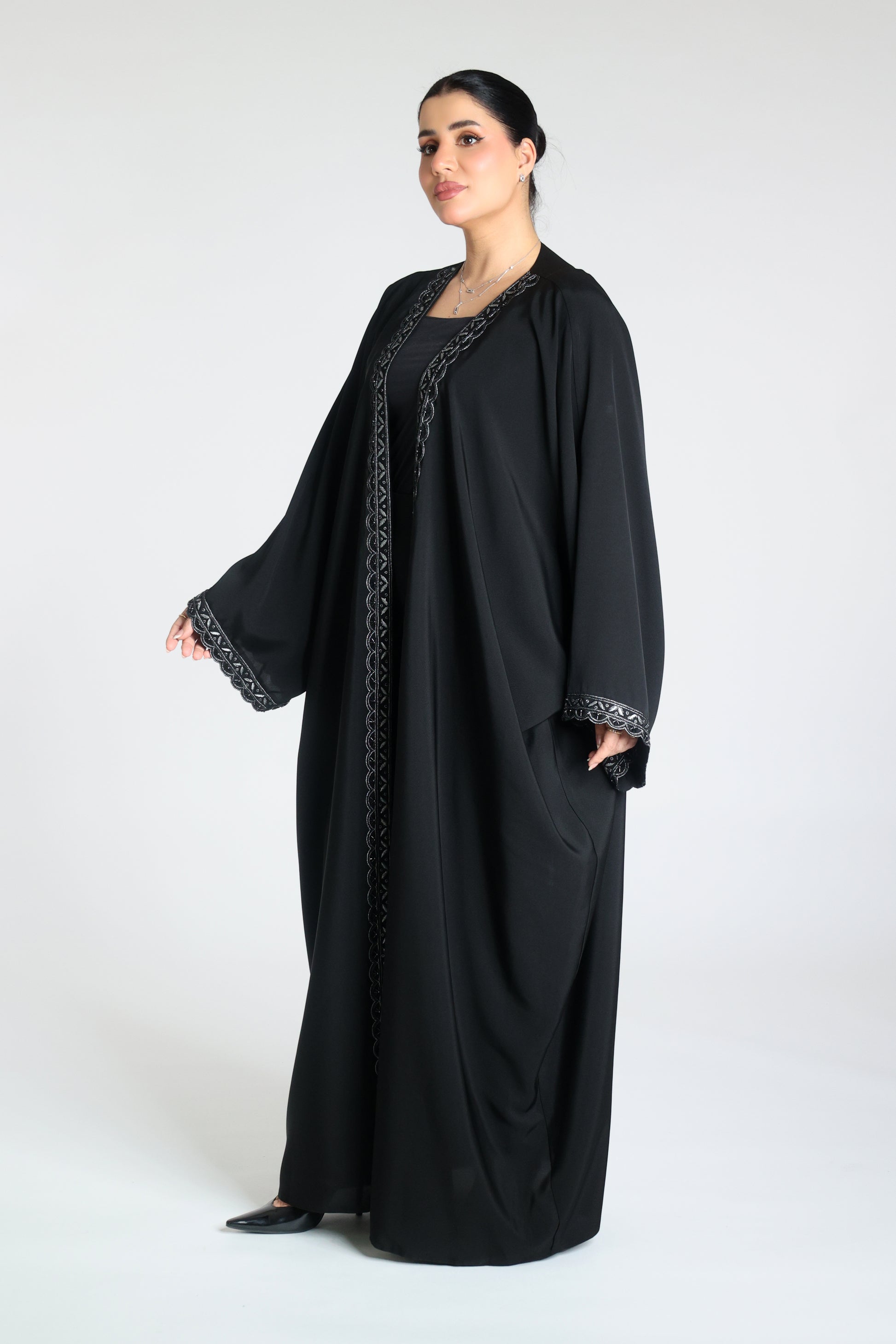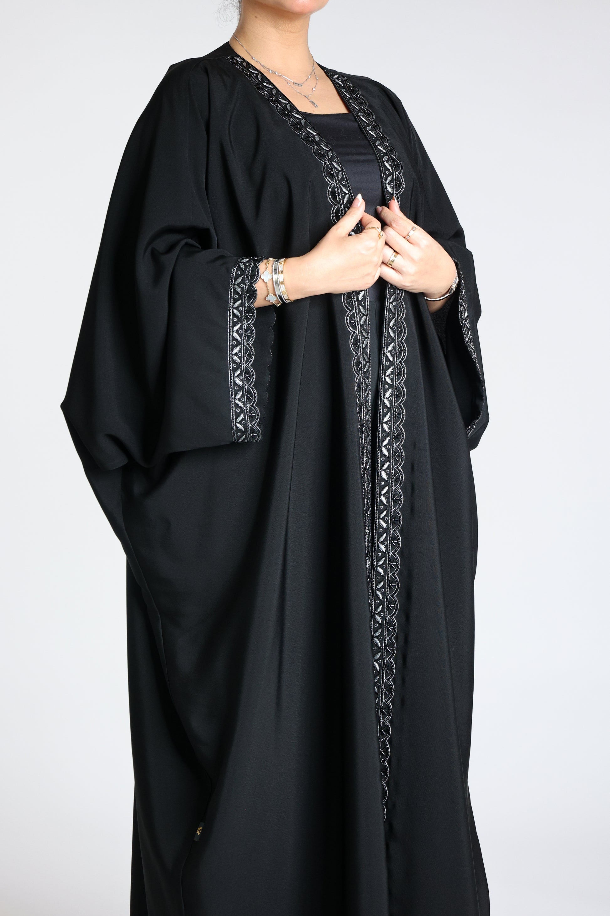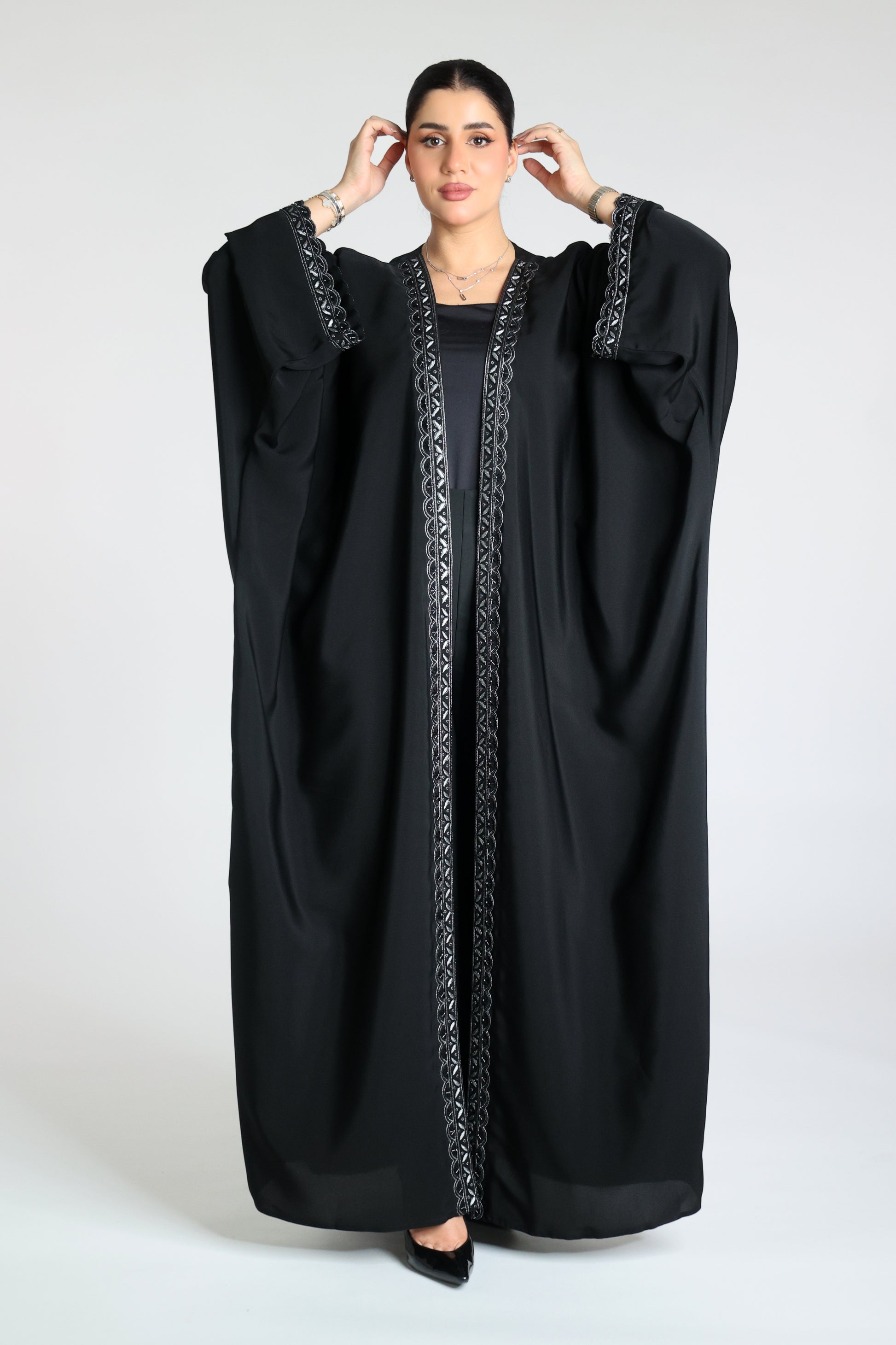 Abaya made from original Japanese salona fabric in bisht style with handwork on the front and sleeves in gray and silver. Perfect for events and evenings.