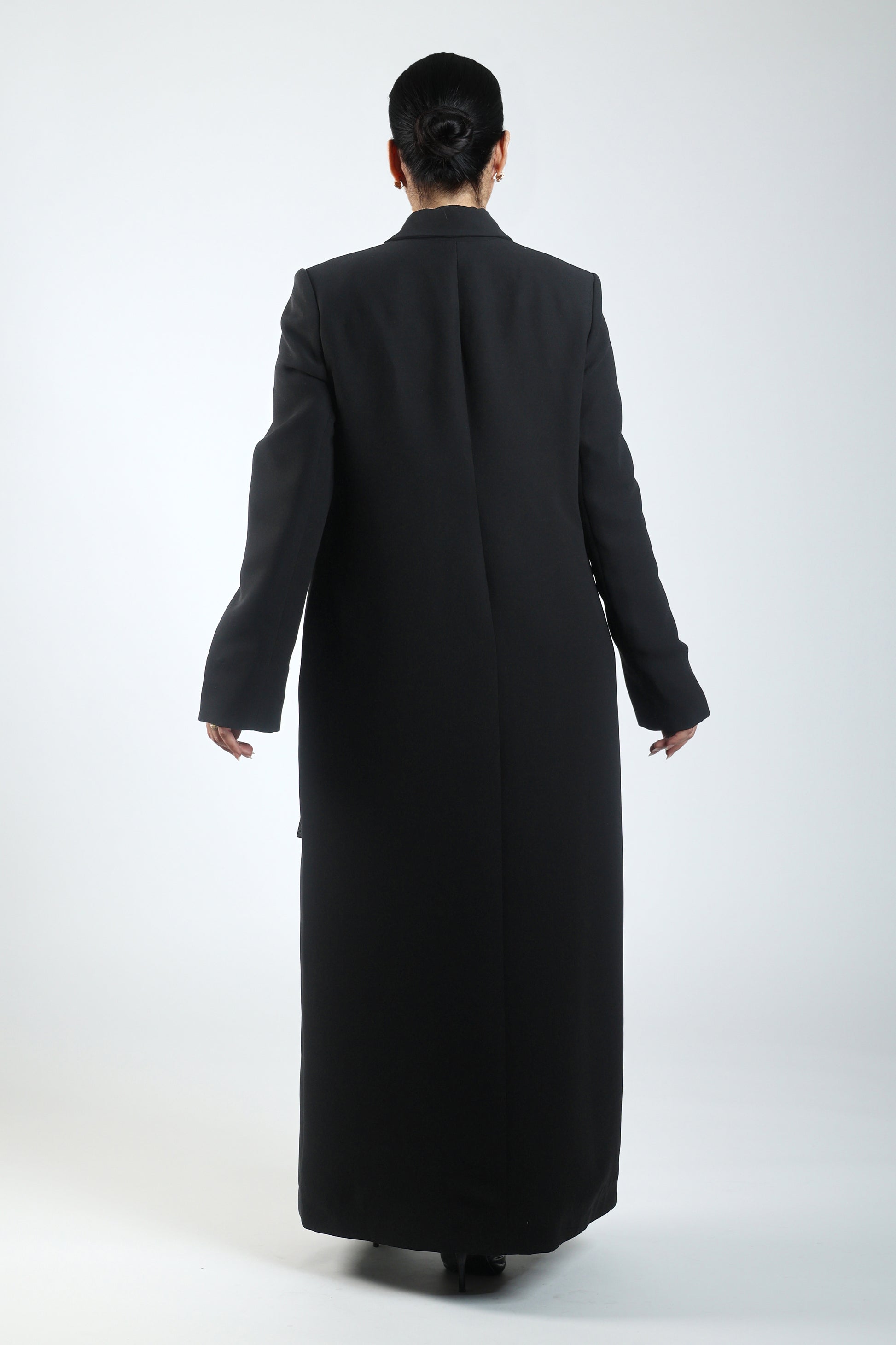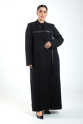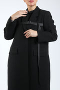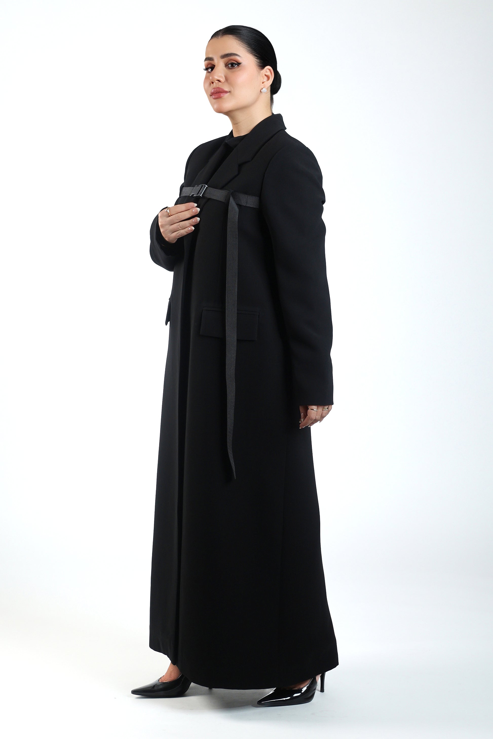 Abaya made from special Rolex fabric in black blazer style with pockets and a belt strip across the chest; modern and elegant.