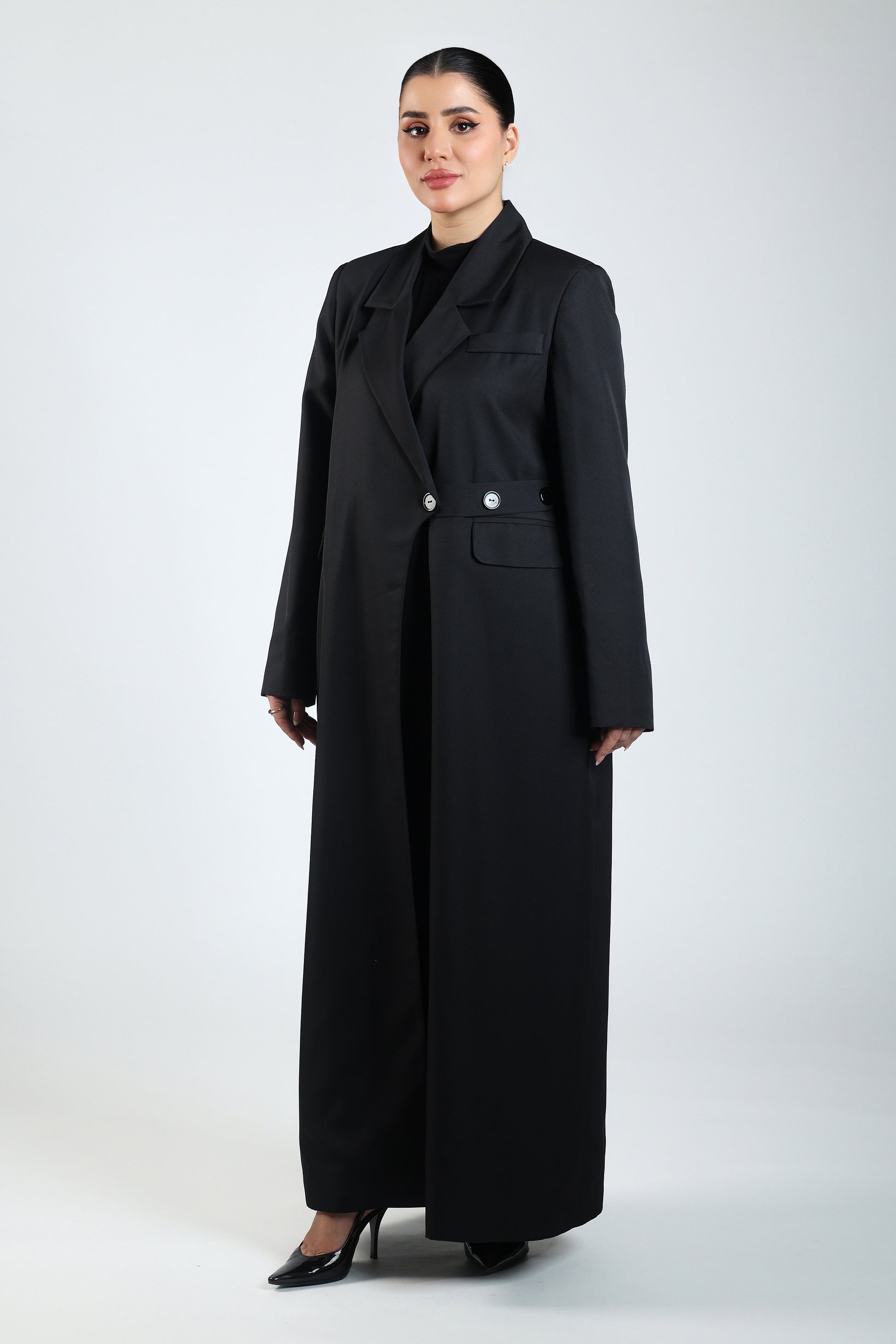 Abaya made from gabardine fabric in black blazer style with a side tie; modern and practical