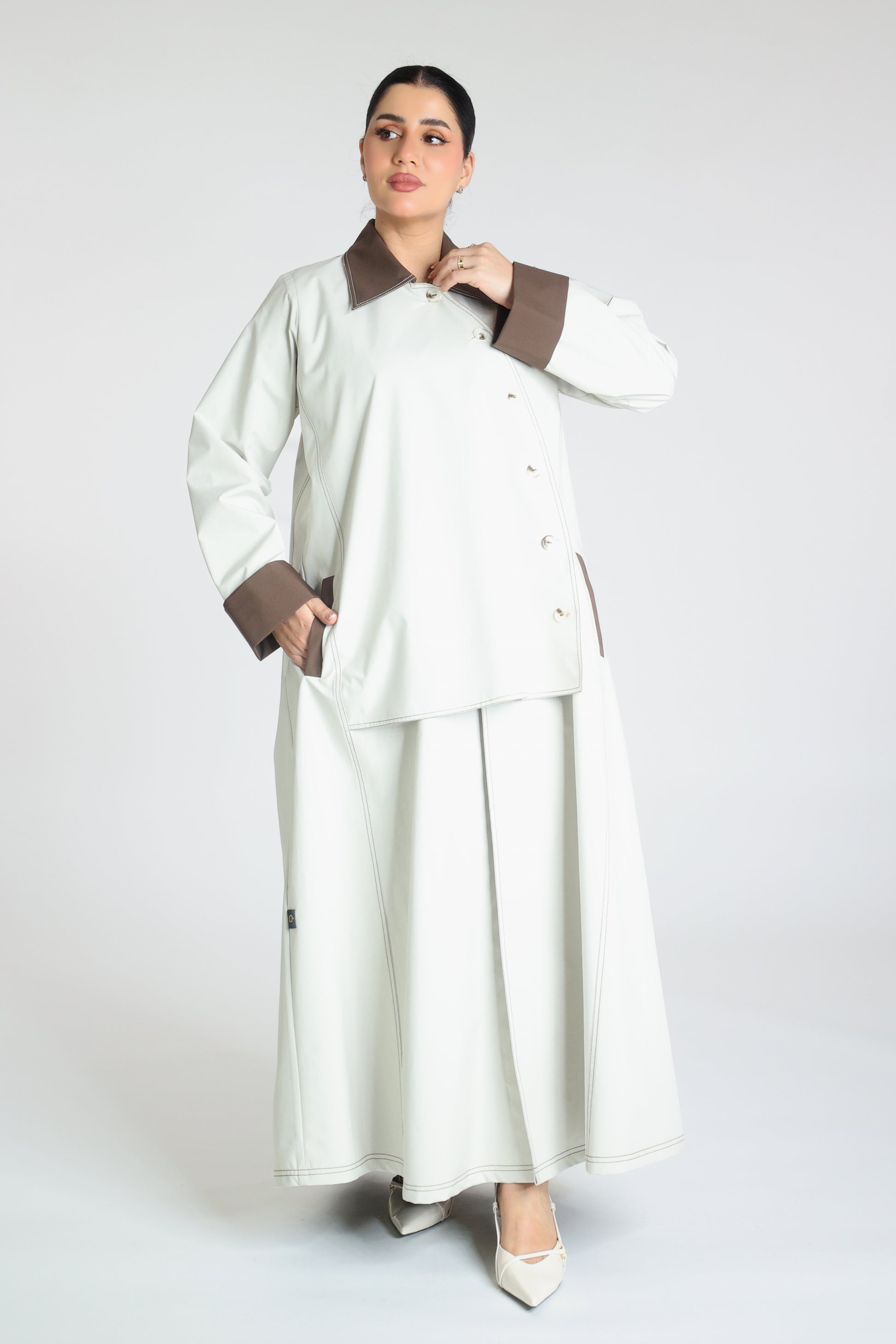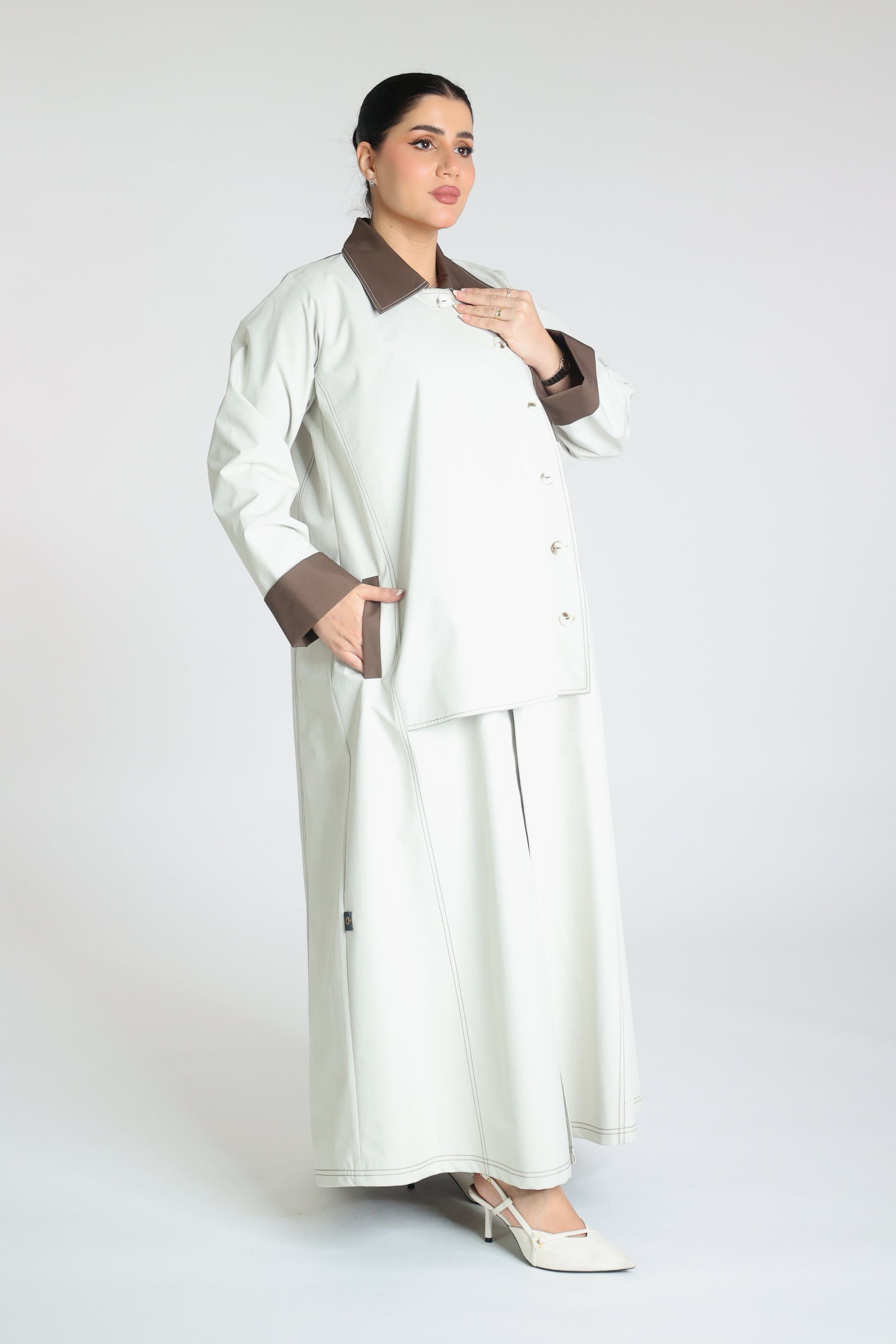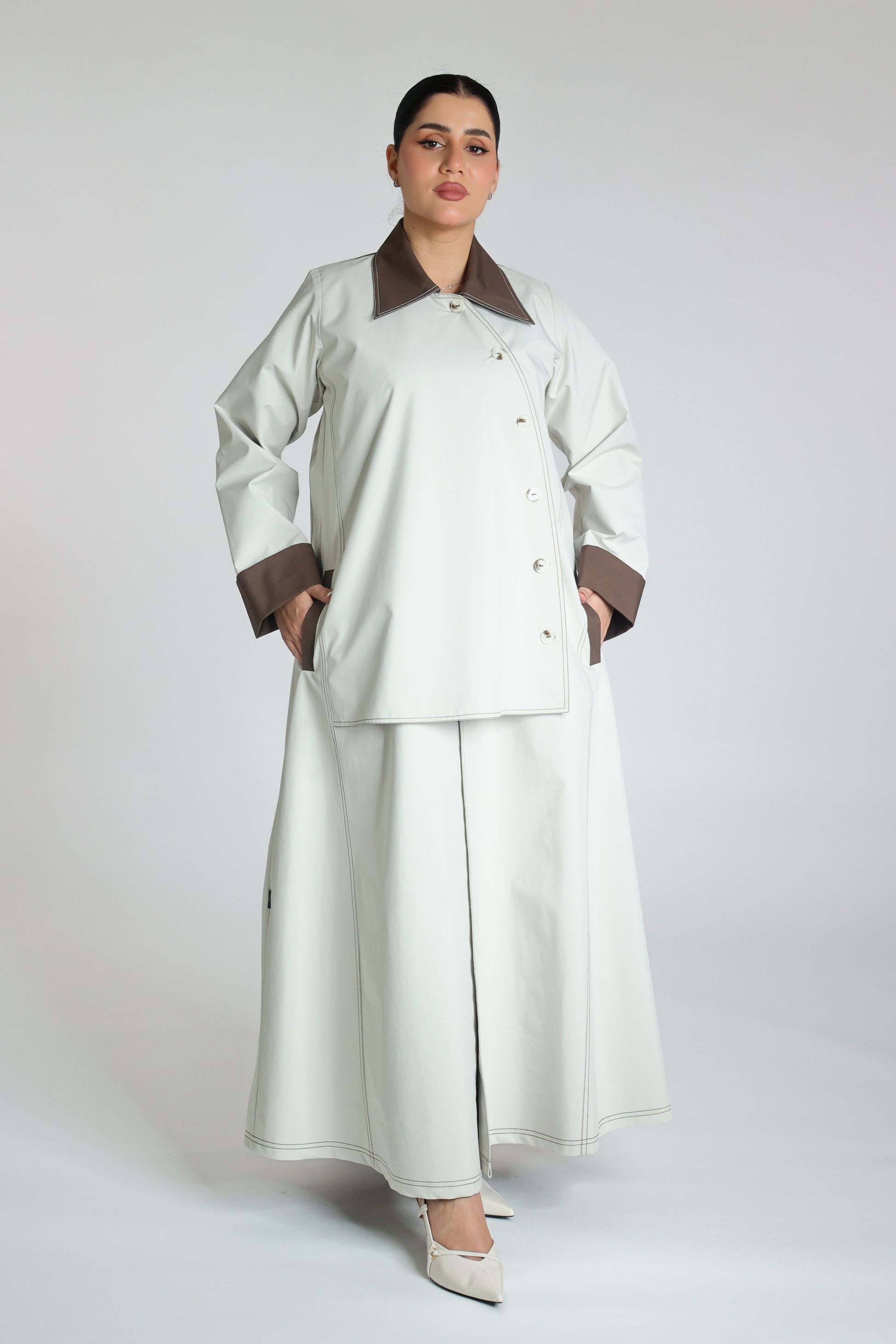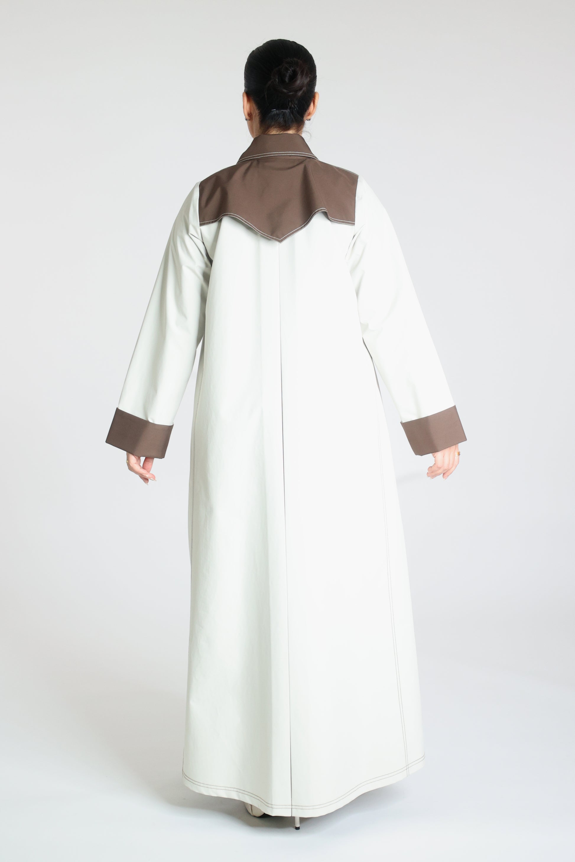 Abaya made from beige trench coat fabric with a collar and brown buttons and a pleat at the back; practical and elegant.