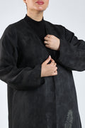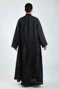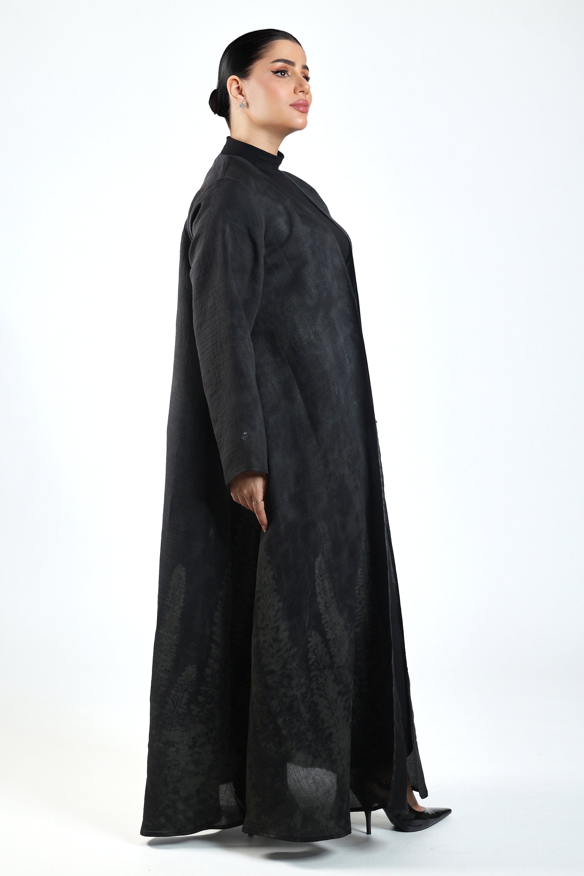 Abaya made from patterned black crepe fabric with an olive-colored hem, flared and open; practical and elegant.
