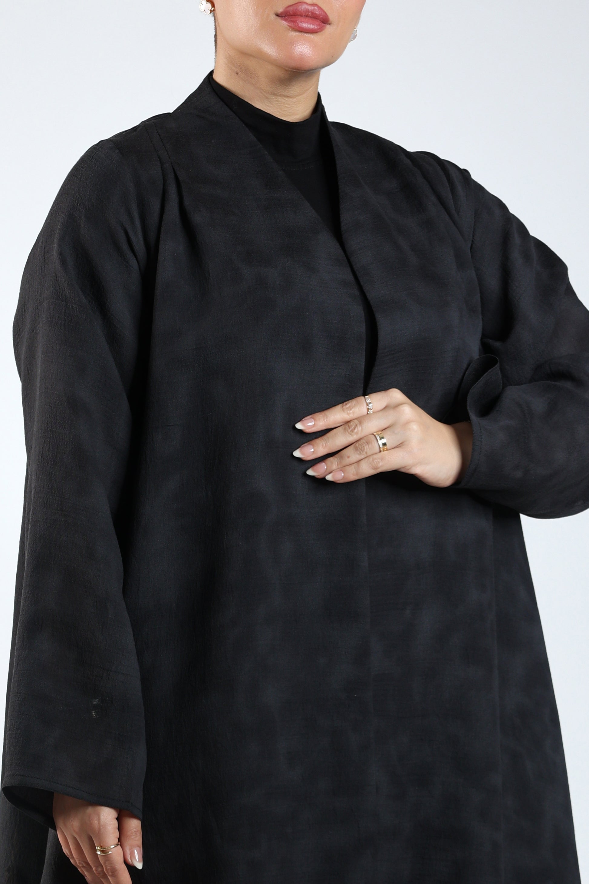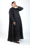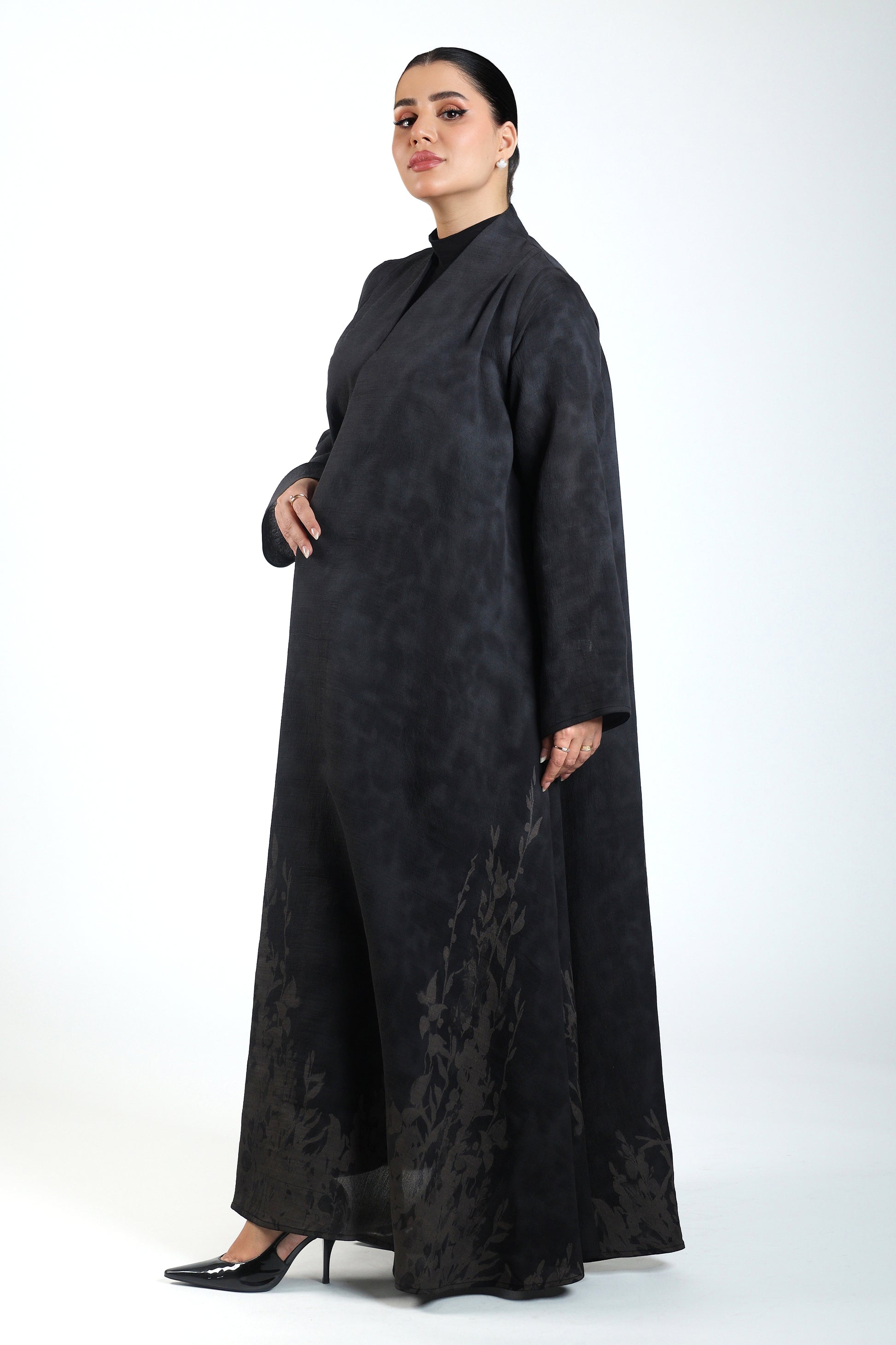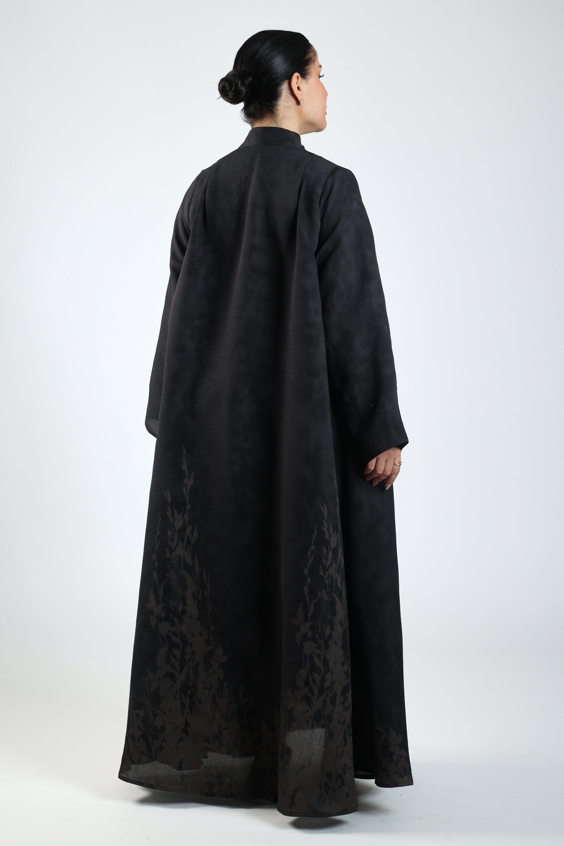 Abaya made from patterned black crepe fabric with a brown hem, flared and closed with full overlap; elegant and practical.