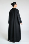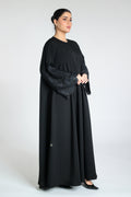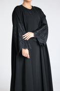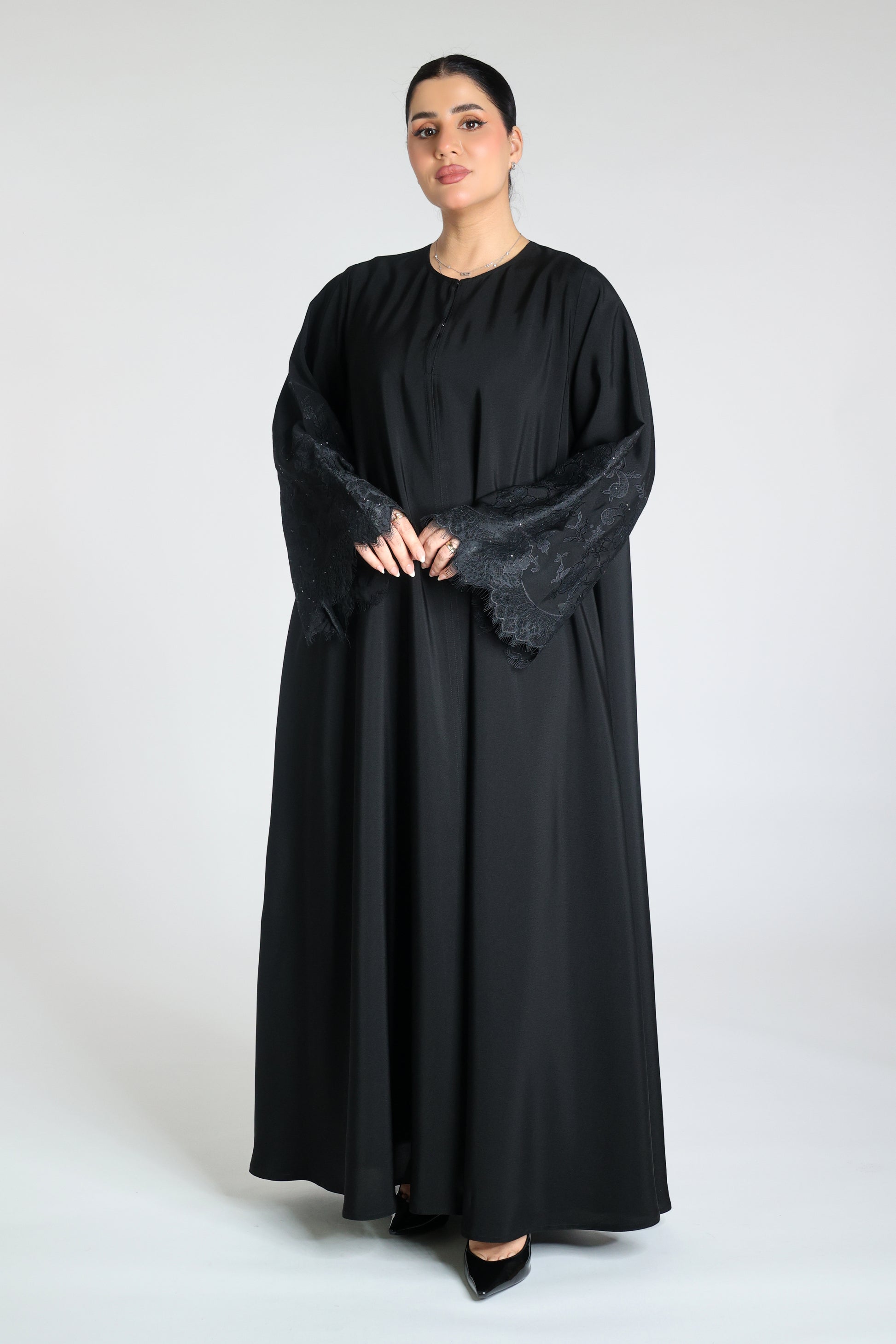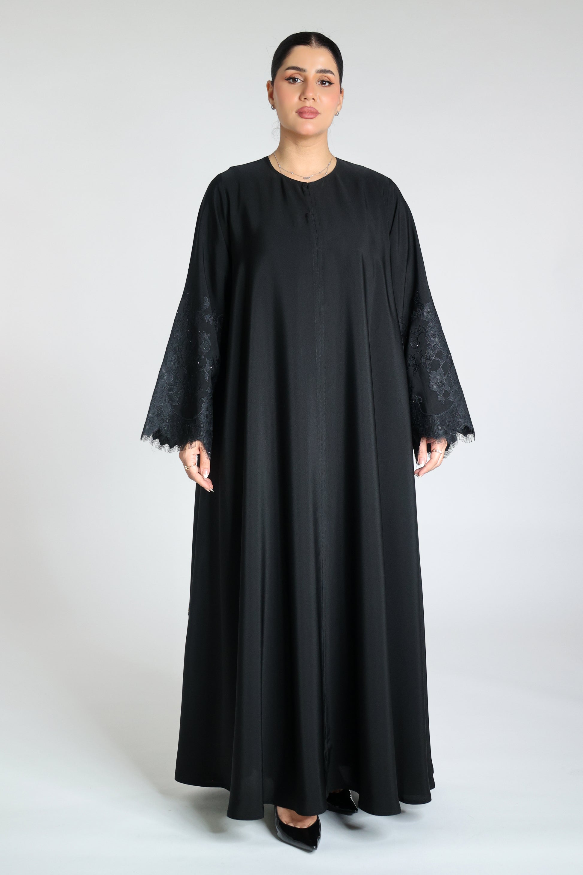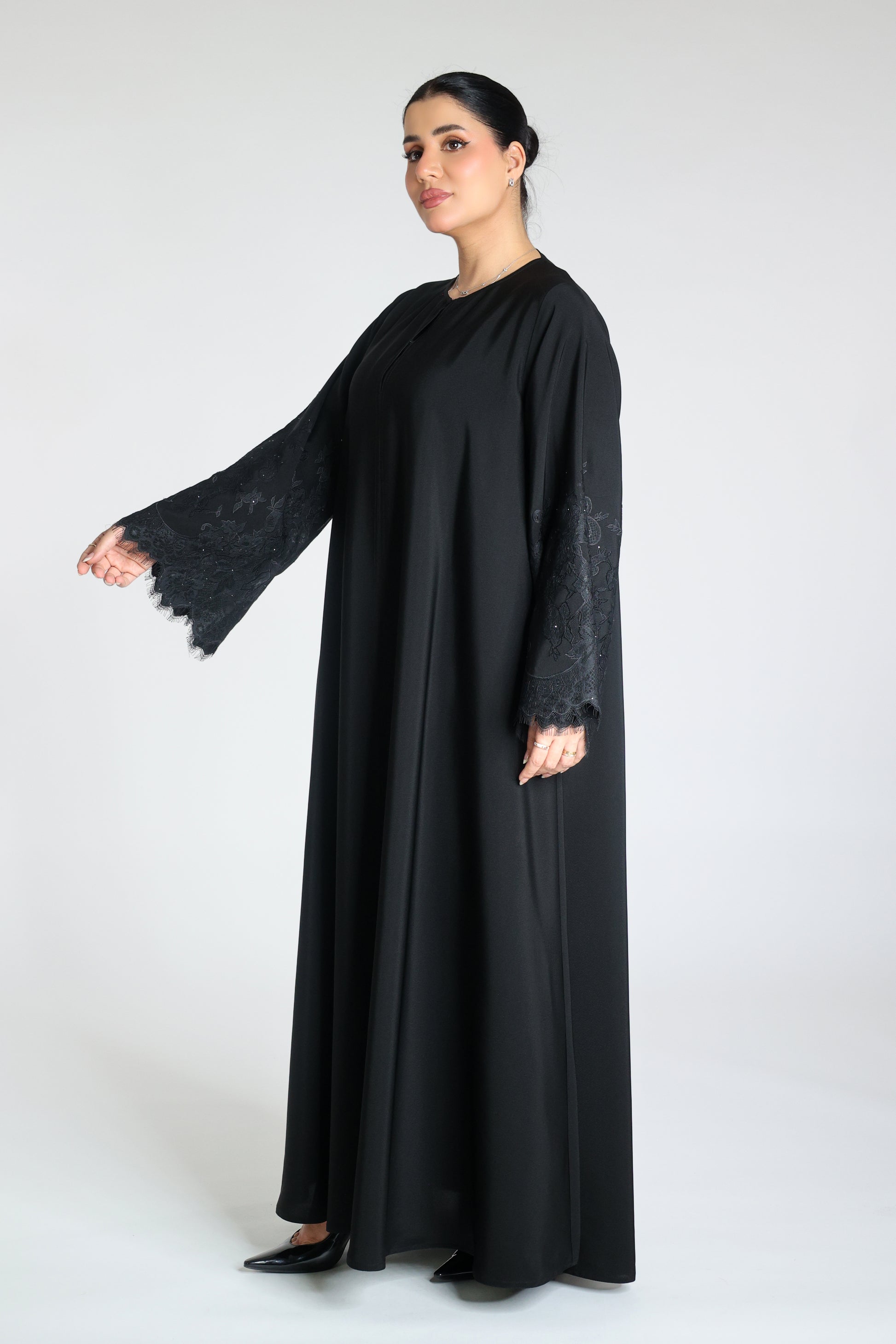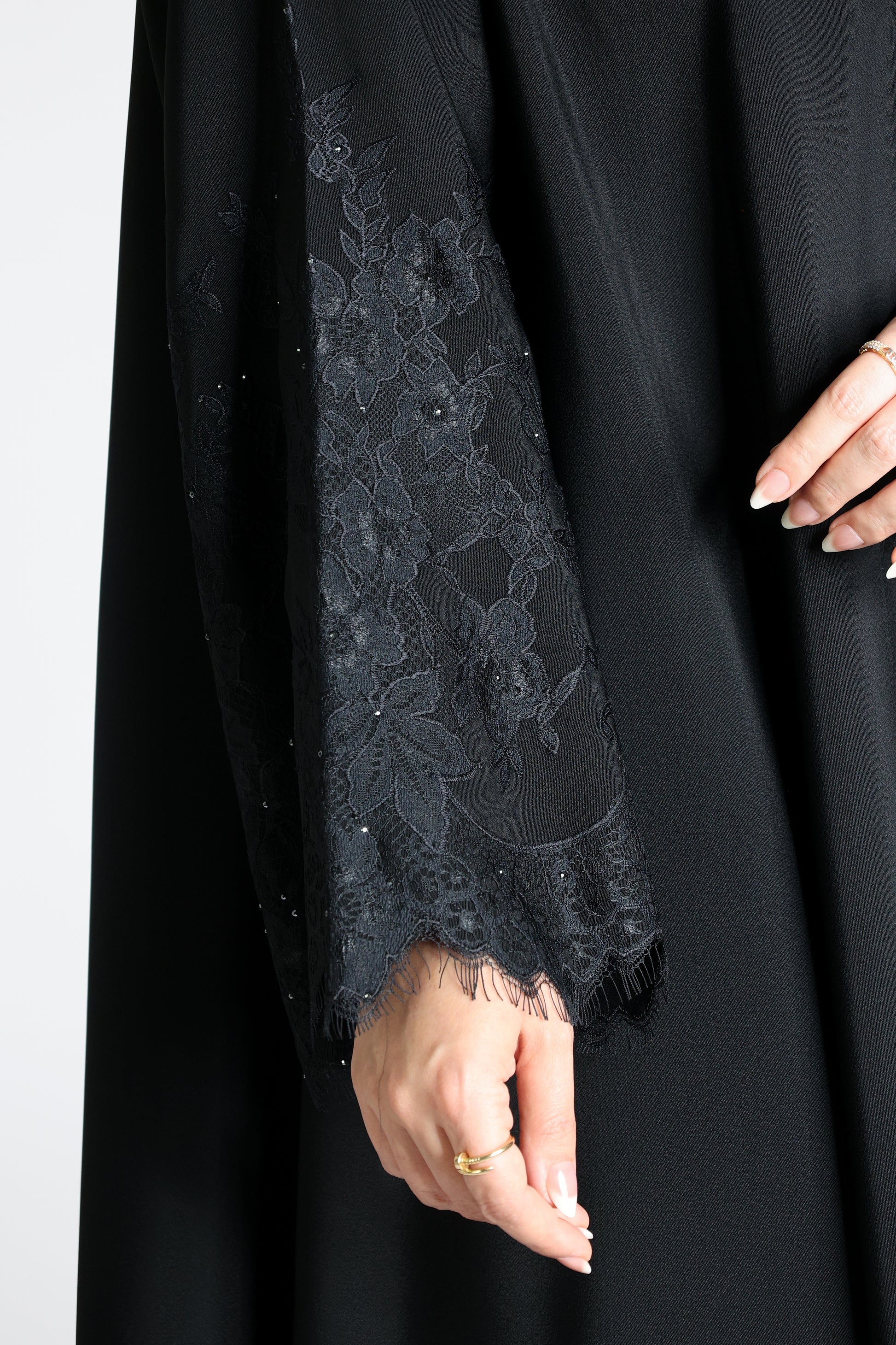 Abaya made from original Japanese soalon fabric in black flared style with black lace on the sleeves, embellished with Swarovski crystals; perfect for events.