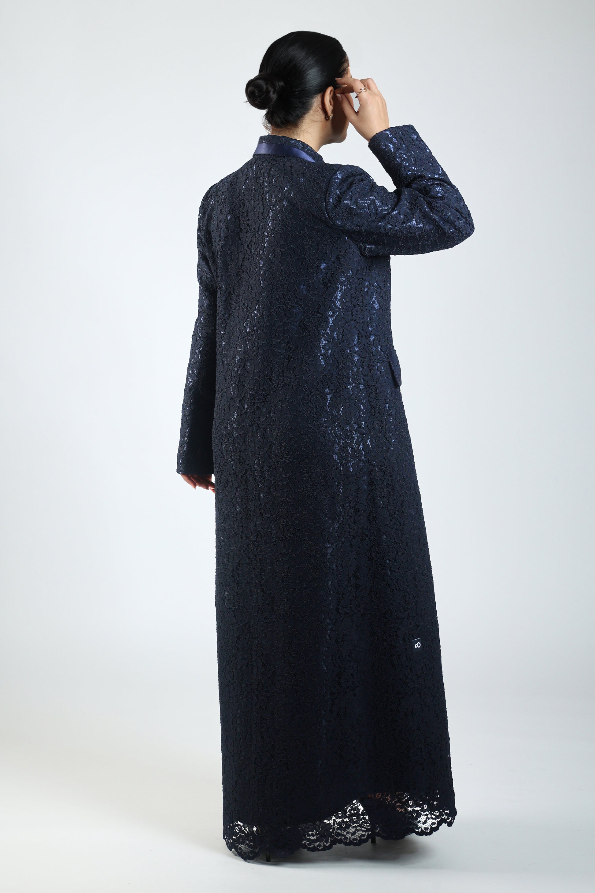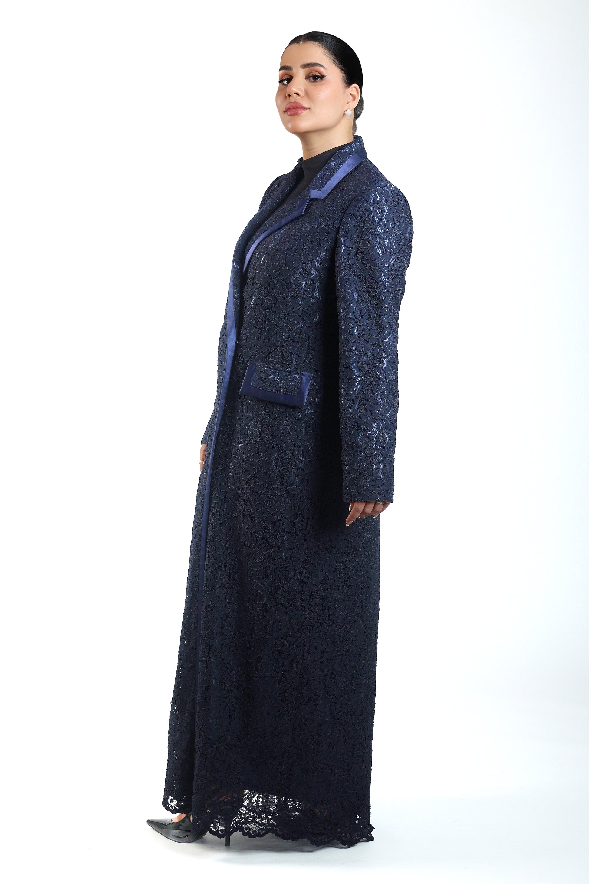 Abaya made from navy lace fabric in blazer style with a collar defined by a satin ribbon; formal and perfect for events.